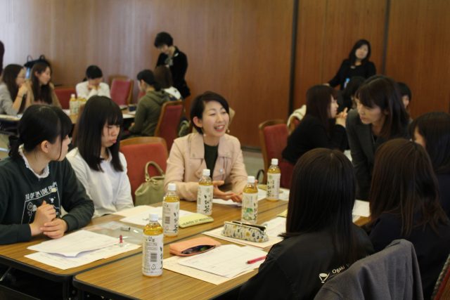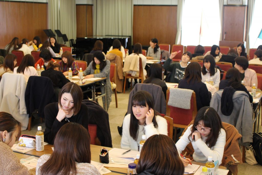 1月10日(水)、音楽総合学科1年生 教養・キャリア基礎演習Ⅱにおいて「岐阜で活躍する社会人女性との交流会」を開催しました。これは岐阜県女性の活躍推進課との連携事業として、若い女性の結婚や出産などのライフイベントを踏まえ、将来ビジョンを描いてみようという趣旨で実施した講座でした。人生における様々な場面において、自分の夢を諦めることなく、それに向かって進むためには何が必要か、社会人女性との交流を通じて考えてみました。自分のライフプランを考える良い機会になりました。