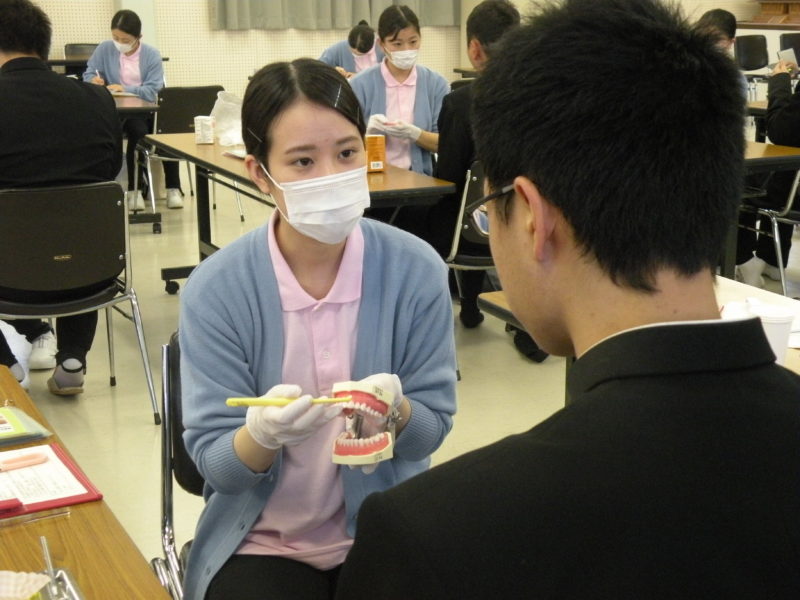 歯科衛生学科 歯科保健指導を行いました 12月10日(火) 歯科衛生学科2年生 57名が大垣商業高校と大垣工業高校にて歯科保健実習を行いました。 学生は緊張した様子で、高校生のお口のチェック、食生活の指導やブラッシング指導などを行いました。実習後に高校生から『さまざまな指導をしてもらえてよかった』などのコメントがあり、学生にとって貴重な経験になりました。 2019/12/13ニュース