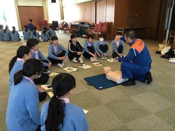 歯科衛生学科2年生 一次救命処置実習を行いました。 11月8日(木)に診療補助実習Ⅲで、一次救命処置(心肺蘇生とAED)の実習を行いました。大垣北消防署から5名の署員の方に来ていただき、マネキンを使用して心臓マッサージ、人工呼吸、AEDの使用方法を学びました。臨床の場において、訪問歯科診療等で一次救命処置が必要な場面に遭遇した時に、冷静な対応がとれる知識を得ることが出来ました。 2018/11/9ニュース
