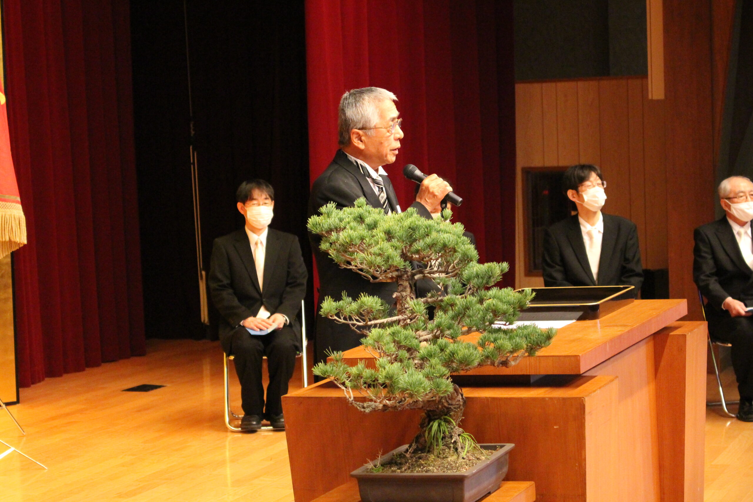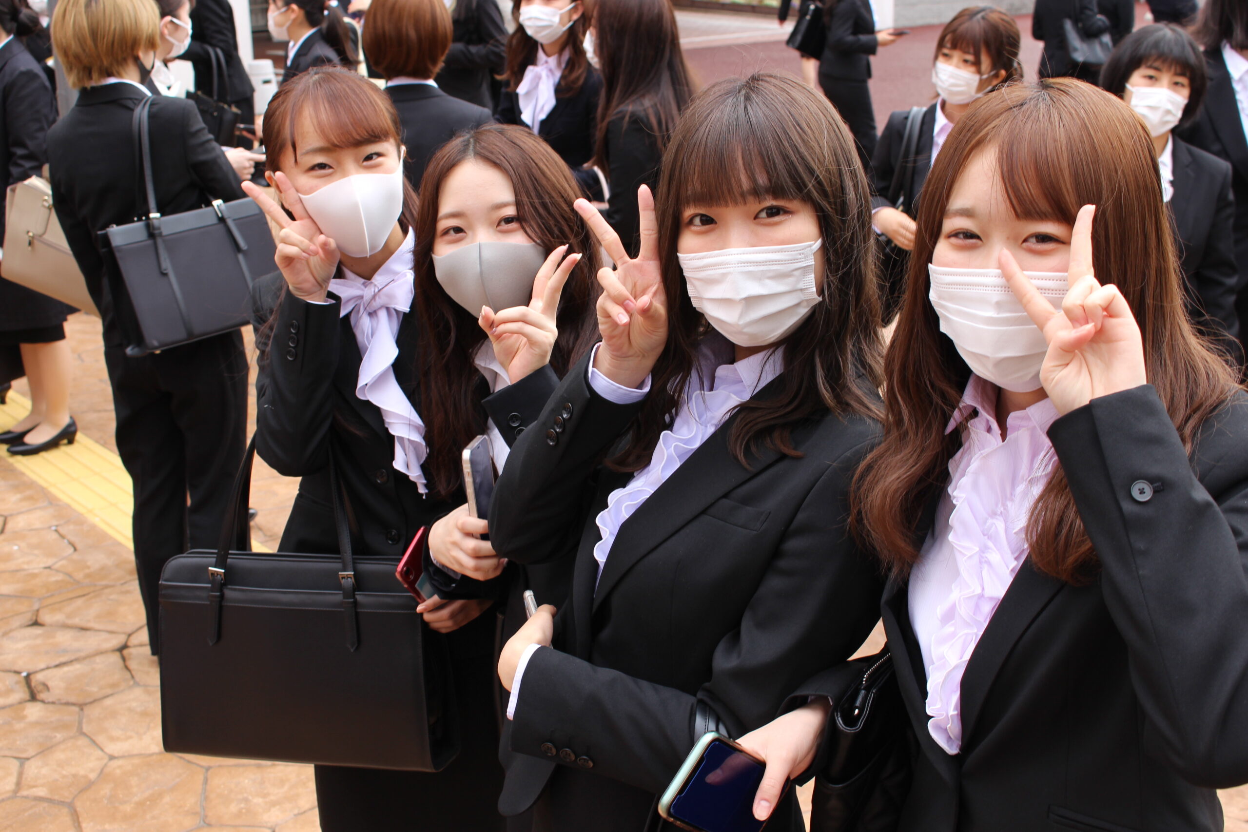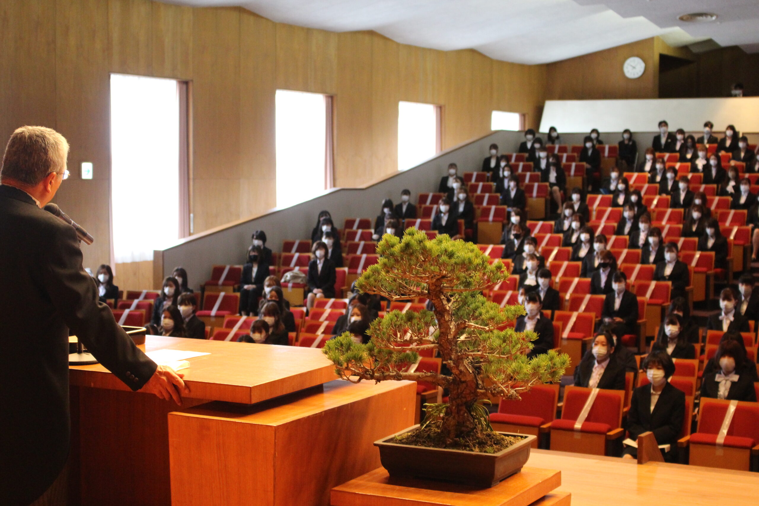 今年度も新型コロナウイルス感染拡大防止の観点から、新入生と教職員のみで執り行い、学内各所に消毒液を設置して、会場内は換気するとともに座席の間隔を空けるなど、式典の規模を短縮する措置をとりました。また、出席者には、マスクの着用をお願いしました。