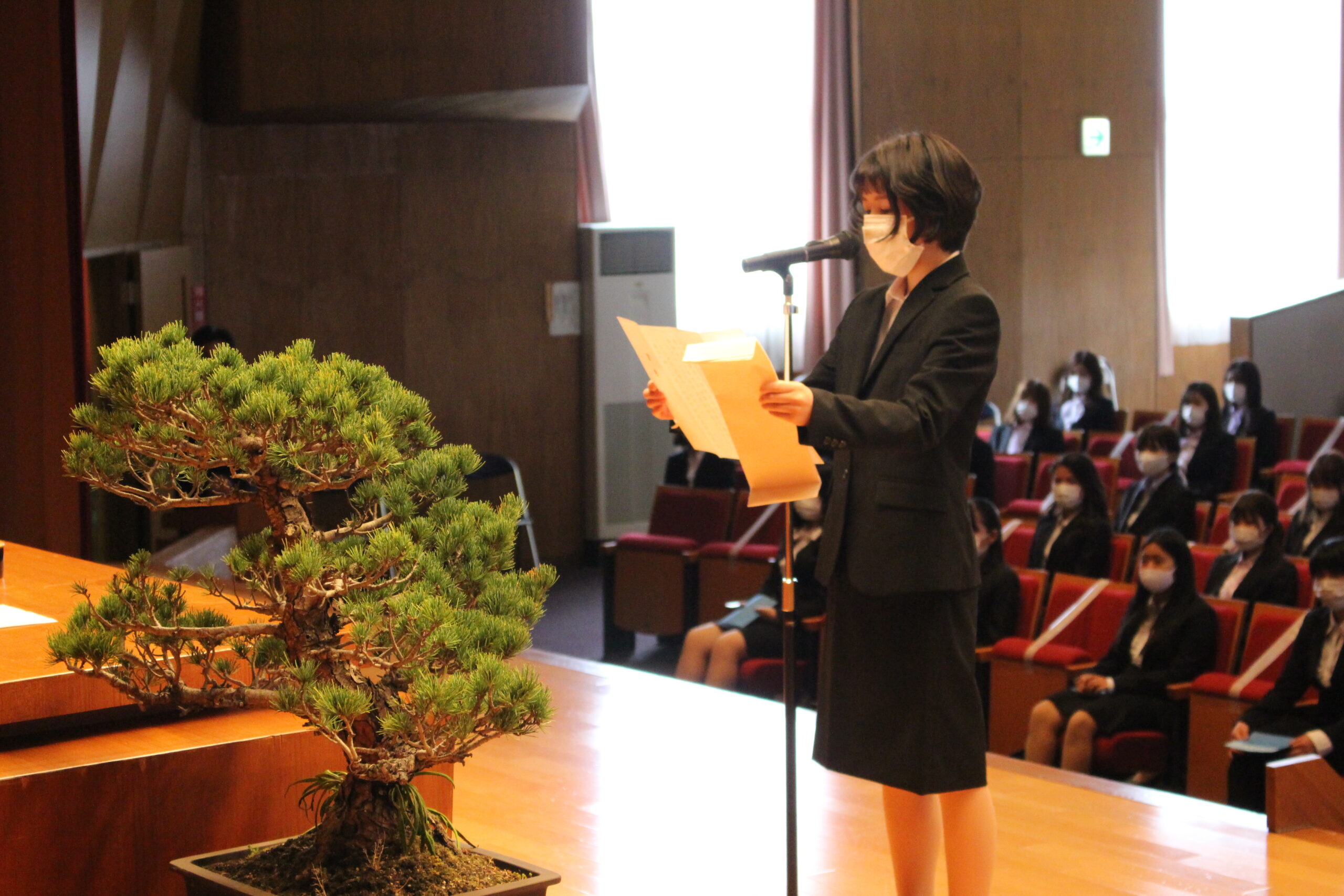 曽根学長から「大学は巣立ちへの準備をするところです。実学のみならず人間力も養ってください。」と式辞があり、新入生を代表してデザイン美術学科の学生から「専門的知識と技術の修得と豊かな人間性の形成をめざし、自己の目標に向かって日々努力します。」と宣誓がありました。