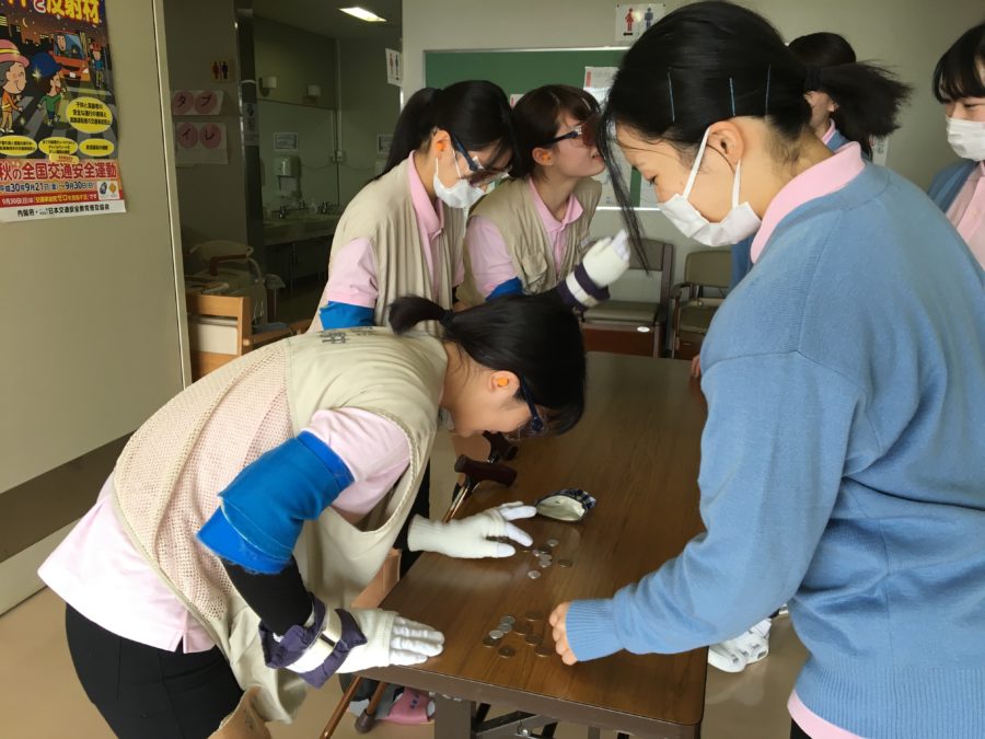 学生はさまざまな装具を身につけて80歳を体験するため、目は白内障で見えづらく、腕と膝の関節が曲がりにくくなりました。いつもならスムーズにできるペットボトルの開封や、小銭の出し入れ、階段の昇降に苦戦しました。また、倒れた杖を拾うことも大変だということが分かりました。