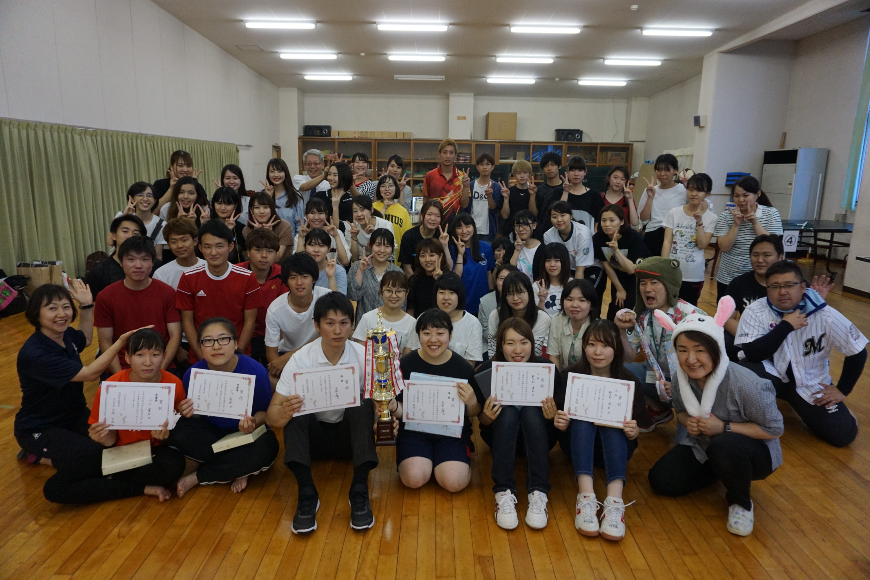 卓球大会を開催しました! 6月28日(金)に卓球大会を開催し、本学の学生および教職員、岐阜協立大学の学生合わせて約60名が参加しました。 ペアで声を掛け合って試合に臨み、大いに盛り上がるイベントとなりました。 卓球大会を通して、体を動かすことの楽しさを再認識し、参加者にとって日頃の運動習慣を見直す良い機会となりました。 2019/07/2ニュース