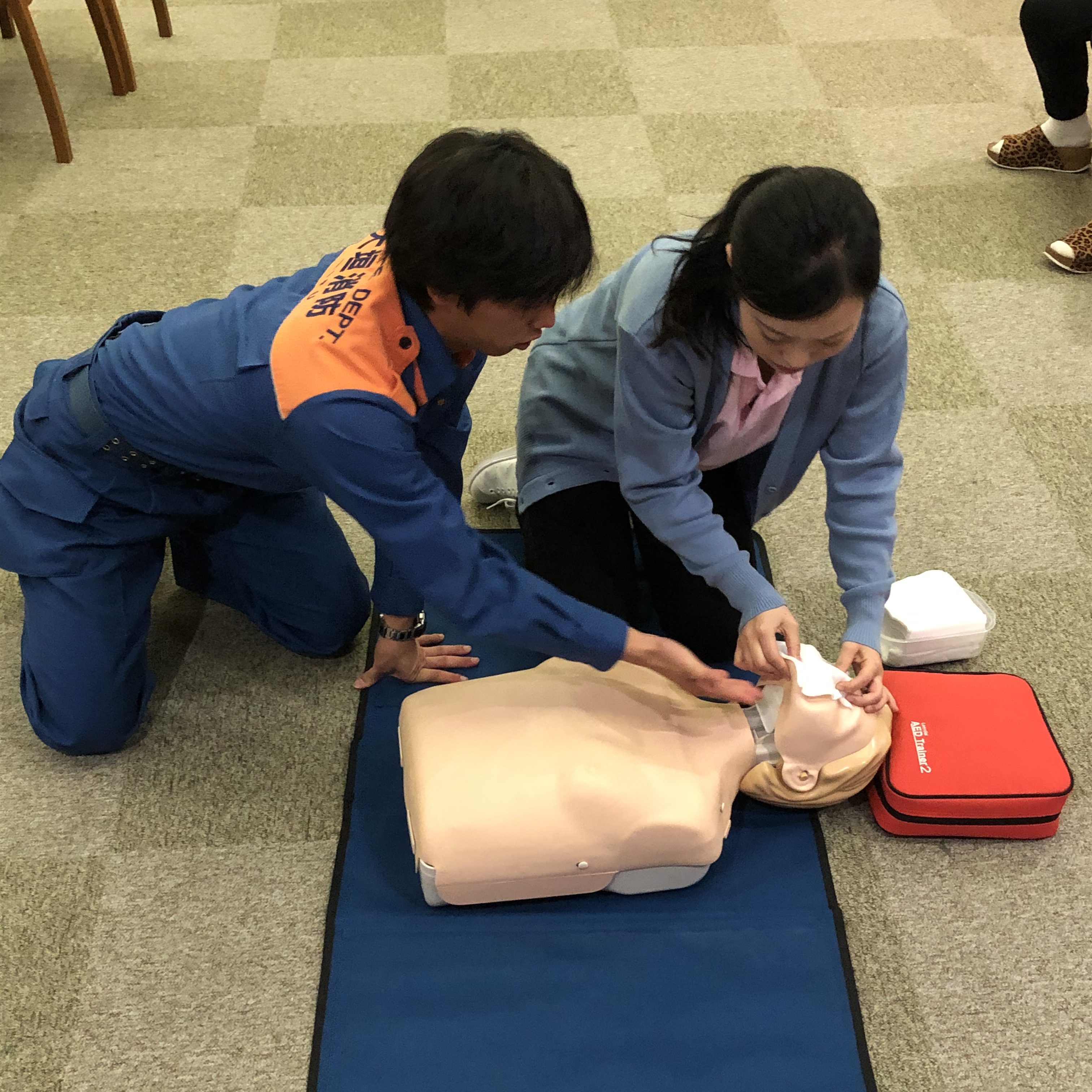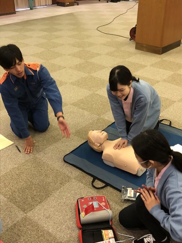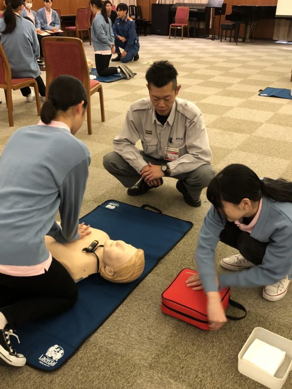 歯科衛生学科 一次救命処置実習を行いました 11月11日(月) 診療補助実習Ⅲにおいて、2年次生が一次救命処置(心肺蘇生・AED)の実習を行いました。大垣北消防署から5名の署員の方にお越しいただき、マネキンを使用して心臓マッサージ、人工呼吸、AEDの使用方法を学びました。 日常生活や、臨床の場においても偶発的に一次救命処置が必要な状況を想定して、冷静な対応ができる知識を得ることができました。 2019/11/14ニュース