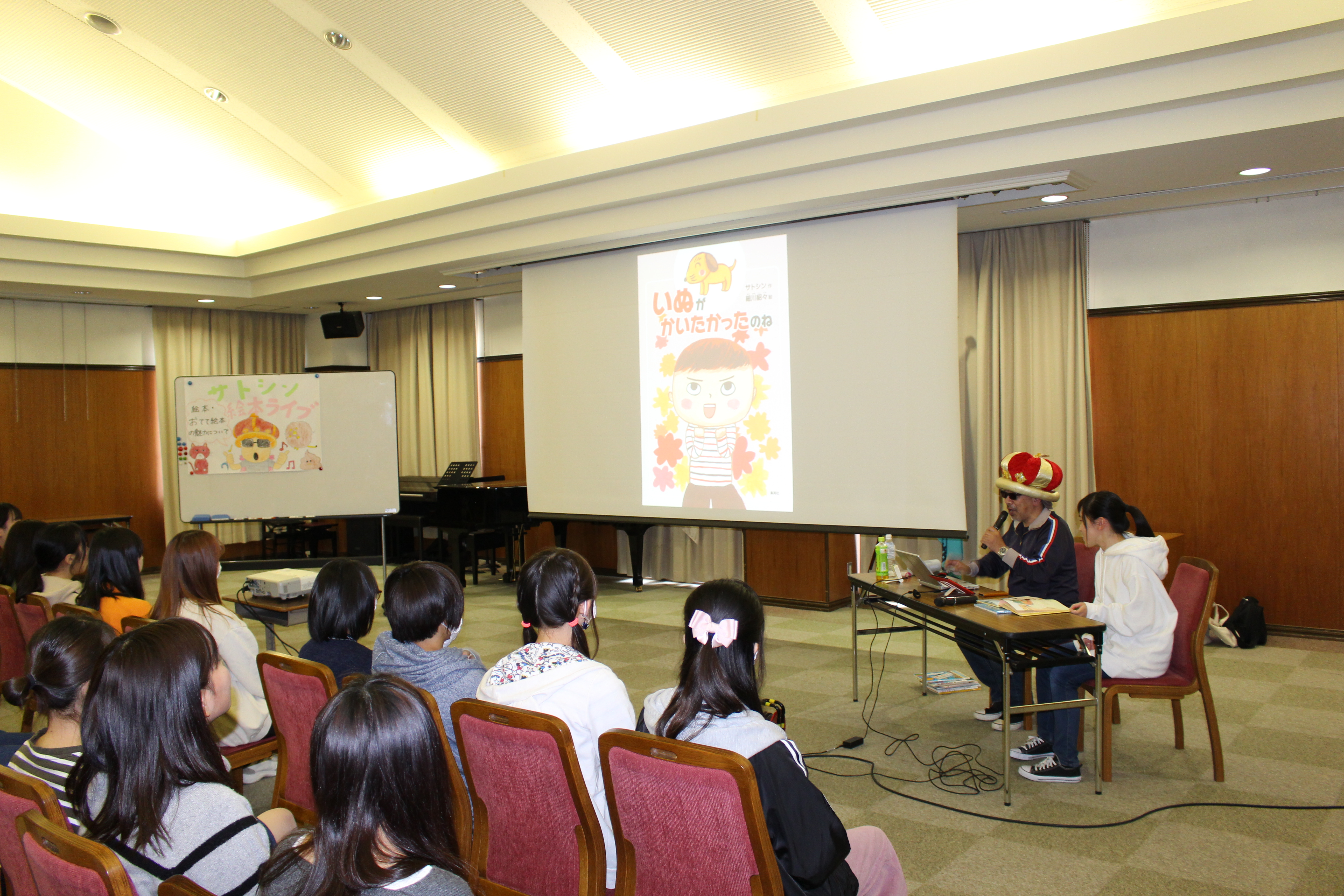 11月13日(水)に絵本作家のサトシンさんにご来学いただき、幼児教育学科の全学生を対象として、『絵本・おてて絵本の魅力について』と題して、ノリノリのリズムにのせて絵本の読み聞かせ実演、学生との掛け合い読み、「おてて絵本」の実演、絵本の面白さや、保育現場での活用方法などについて語っていただきました。