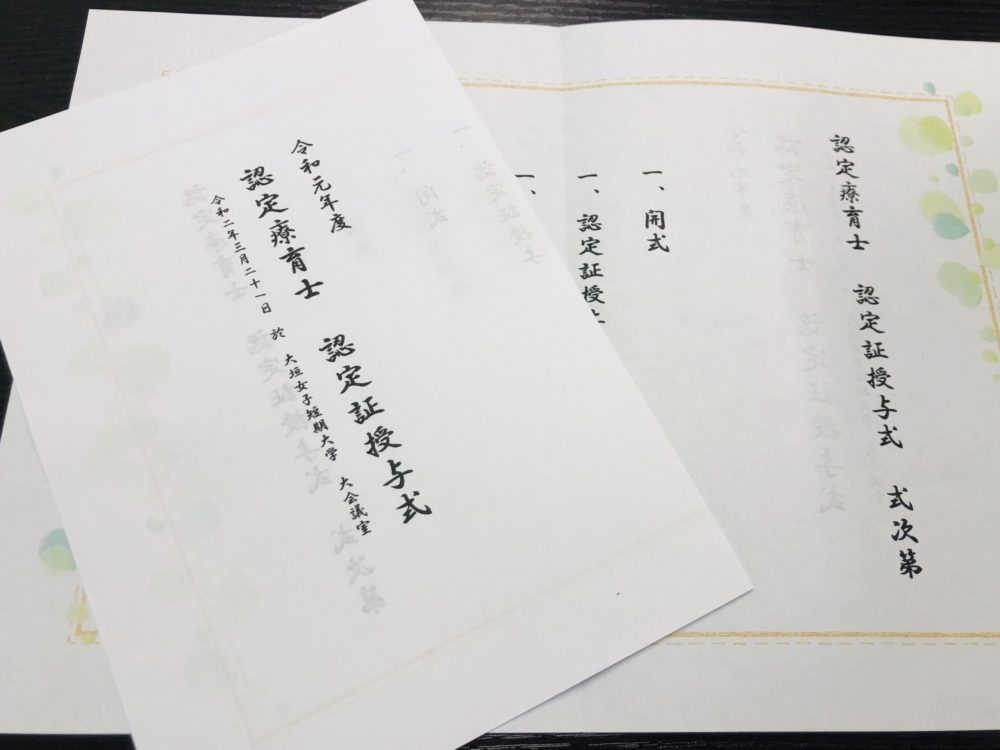 3月21日(土)、本学にて令和元年度幼児教育学科認定療育士認定証授与式が執り行われました。