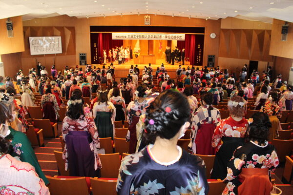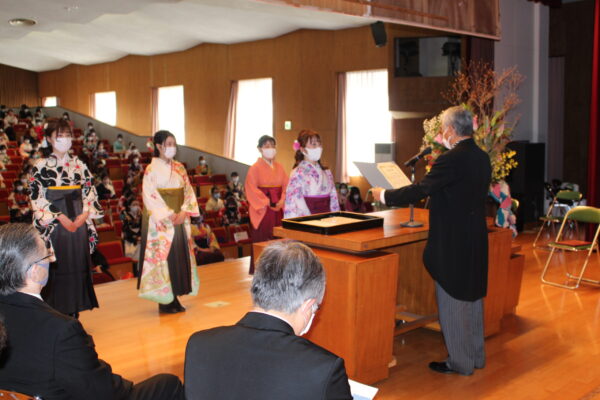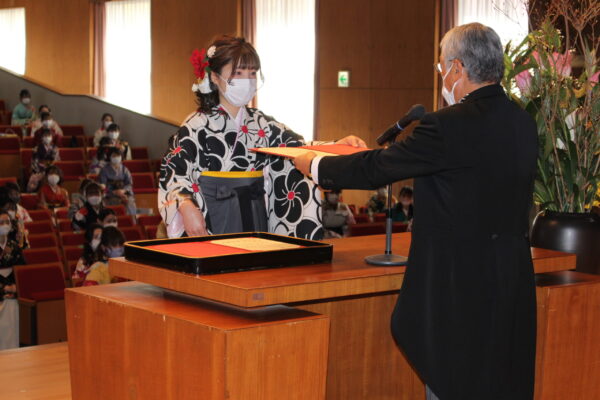 今年度も、新型コロナウイルス感染拡大防止のため、卒業生及び教職員のみで実施し、学内各所に消毒液を設置して、会場内は換気するとともに座席の間隔を空けるなど、式の時間を短縮する措置をとりました。