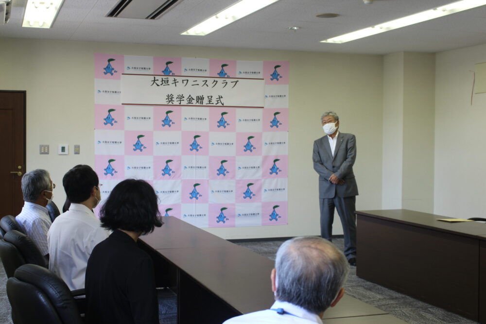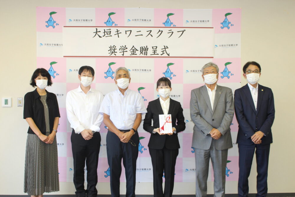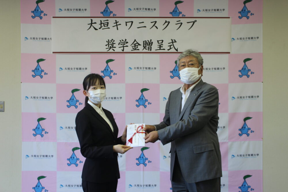 大垣キワニスクラブ奨学金の贈呈式が行われました 令和3年8月30日(月)、本学にて「大垣キワニスクラブ」による奨学金の贈呈式が行われました。 キワニスクラブは、世界中で未来を担う子ども達、助けを必要とする子ども達の支援を活動の柱としている民間の団体です。 大垣キワニスクラブの宇佐美会長から、幼児教育学科2年次生 村山 晴香さんに奨学金が贈呈されました。 奨学金を受けた村山さんは、子どもたちと関わりながら学びを深め、より良い保育者になれるよう努力したいと、お礼とともに決意を述べました。 2021/08/30ニュース