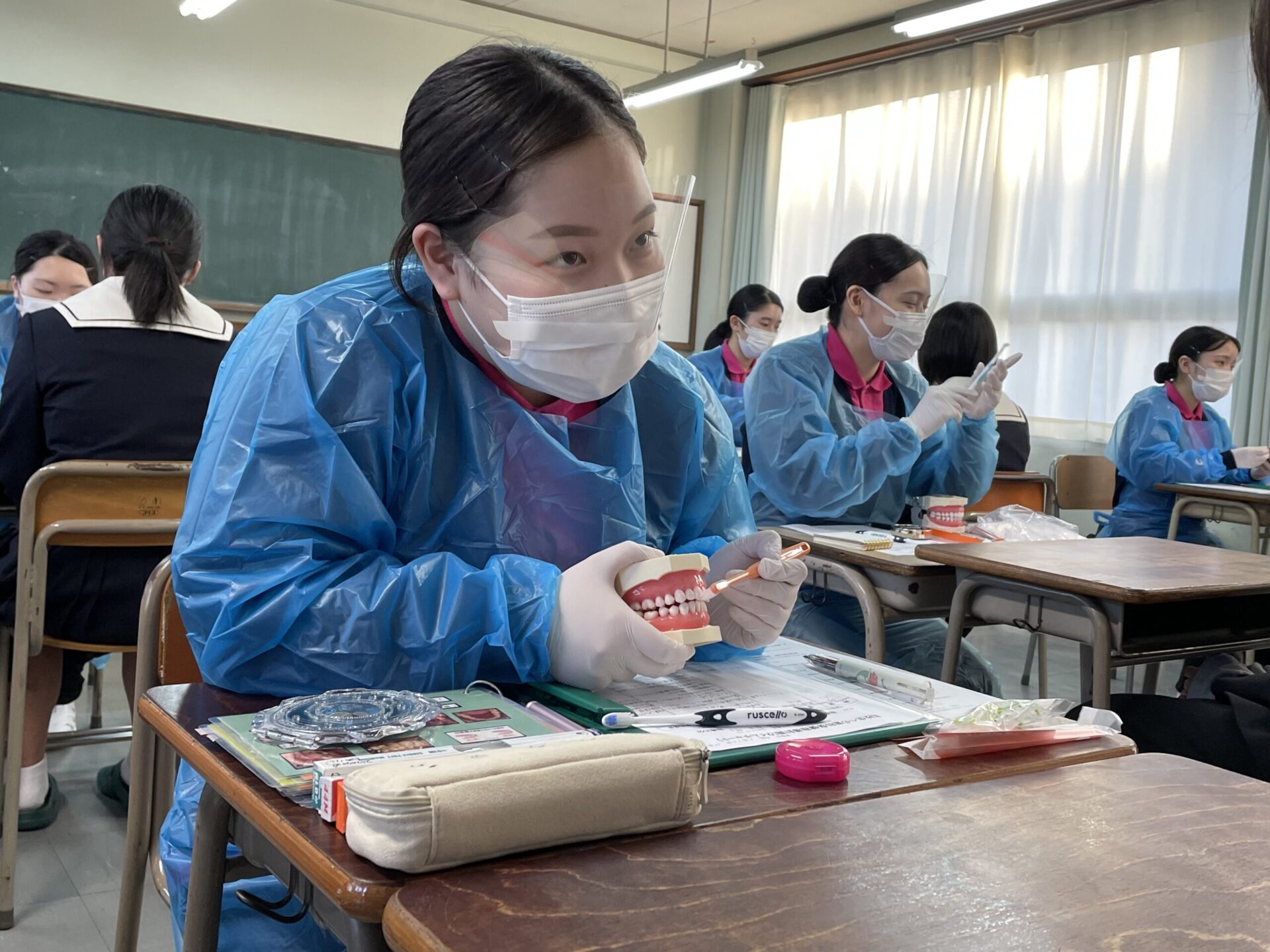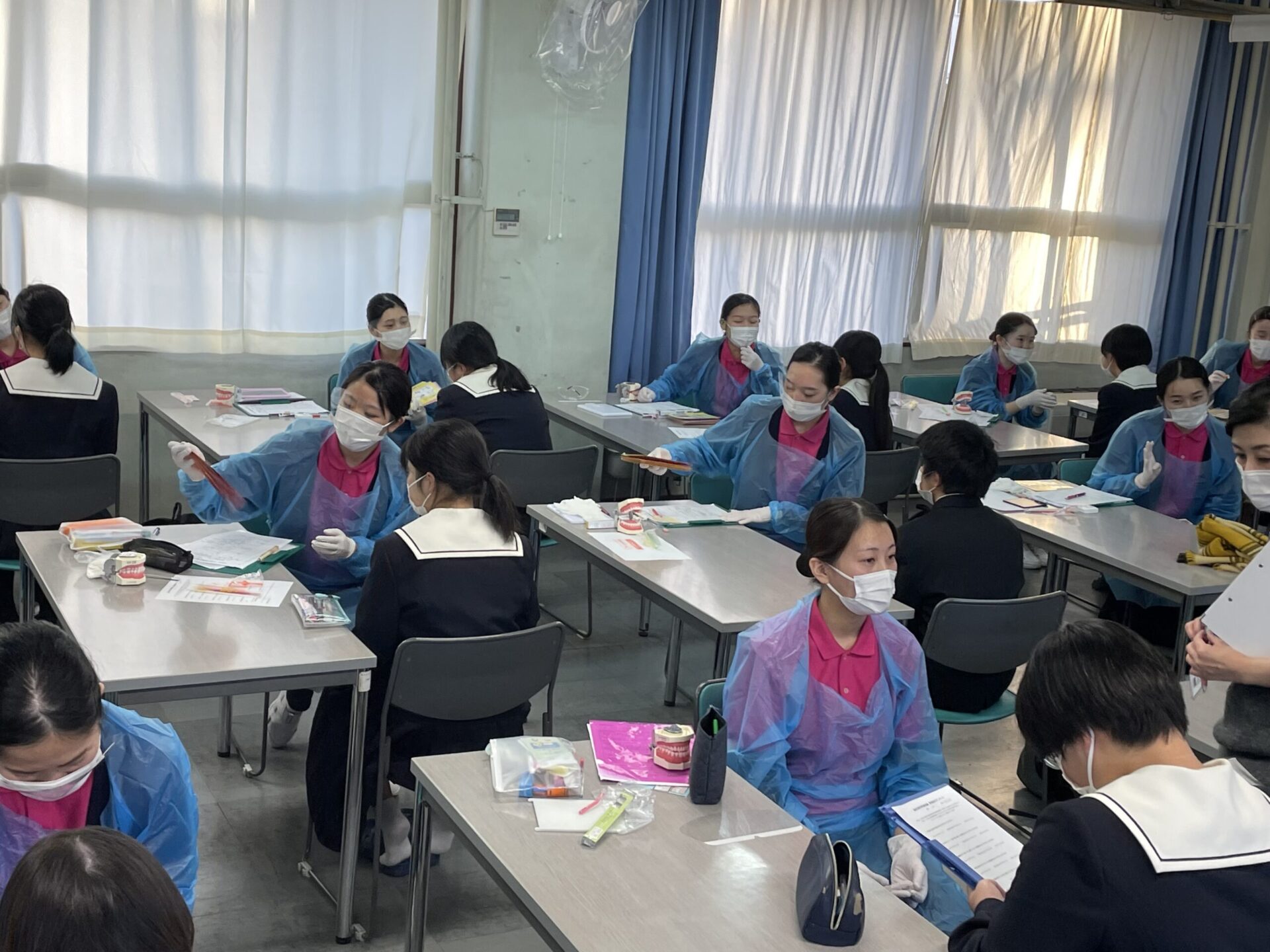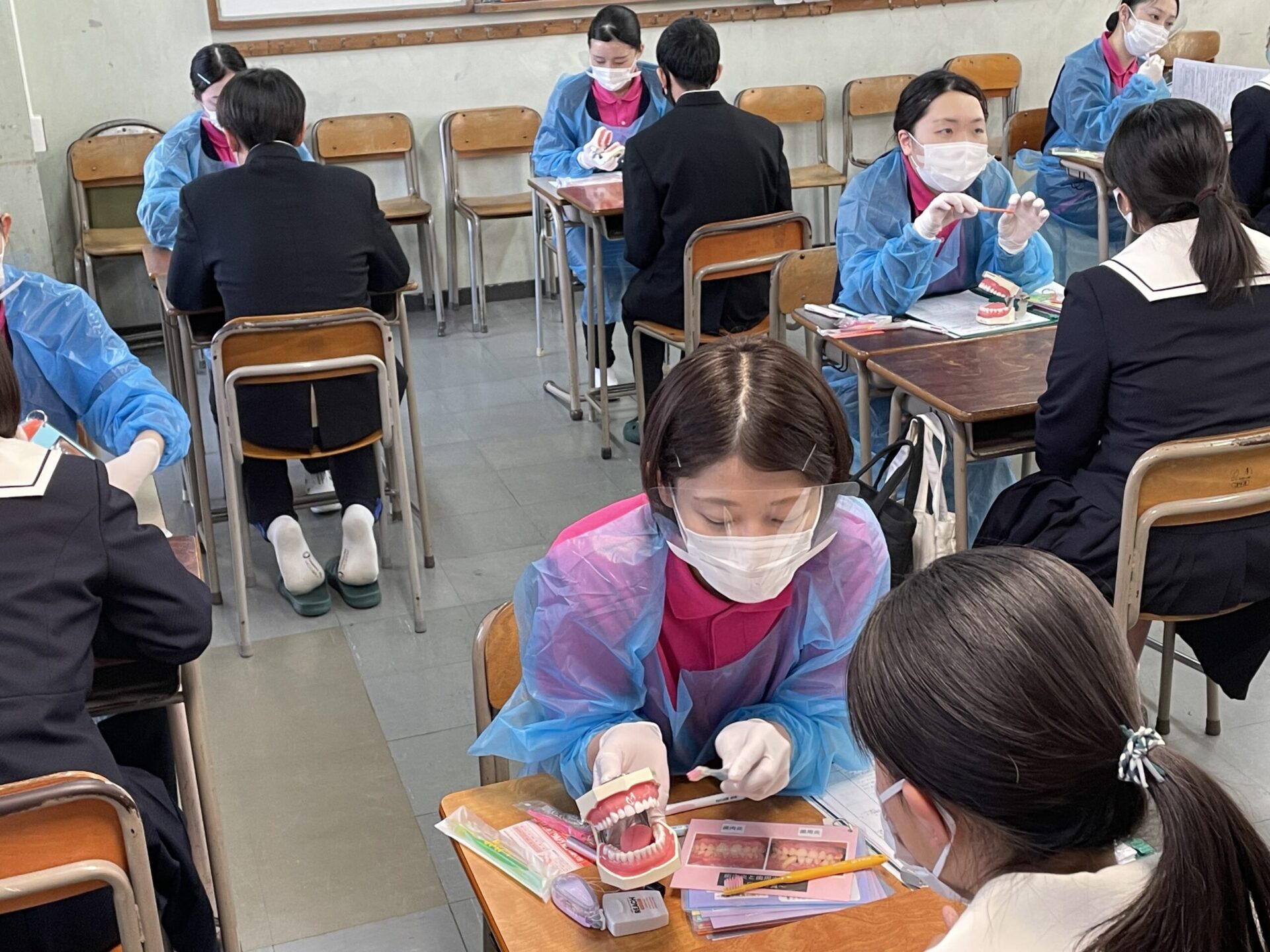 歯科衛生学科 高校で歯科保健指導を行いました 12月8日(水)に歯科衛生学科2年生51名が大垣商業高校、大垣工業高校で歯科保健指導を行いました。 事前に学校検診での結果を分析し、一人一人にあわせて指導案を考えてブラッシングや間食などの生活習慣についての指導をしました。 高校生のみなさんは一生懸命聞いてくれて、学生にとっても大変貴重な経験となりました。 2021/12/13ニュース