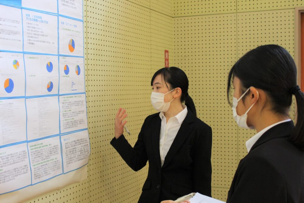 学生一人ひとりが保育に関する研究テーマをもち、この1年間、事例やデータを取りながら分析・研究してきた集大成を発表する場として、真剣に取り組みました。