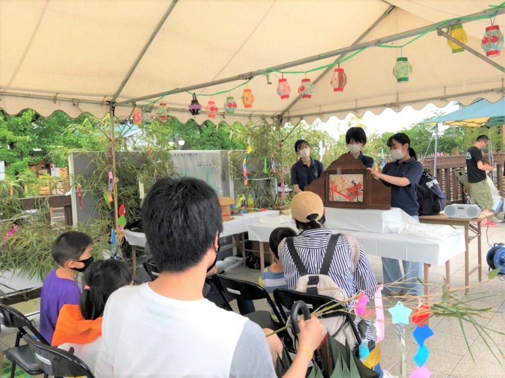 雨の中の開催でしたが、100名以上の方にお越しいただき、小さなお子様から大人の方まで短冊に願い事を書いて楽しんでいただけました。七夕にちなんだ紙芝居の読み聞かせも行い、子どもたちの楽しそうな笑顔がたくさん見られ、学生にとっても貴重な地域交流の機会となりました。