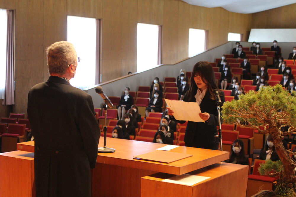 曽根学長は、式辞の中で「社会で活躍できる人材となれるよう、”学びにおける自主性”と”協力して働くことができる人間性”を養ってください。」との激励の言葉があり、新入生を代表して歯科衛生学科の学生から「専門的知識と技術の修得及び豊かな人間性の形成をめざし、自己の目標に向かって日々努力します。」と宣誓がありました。
