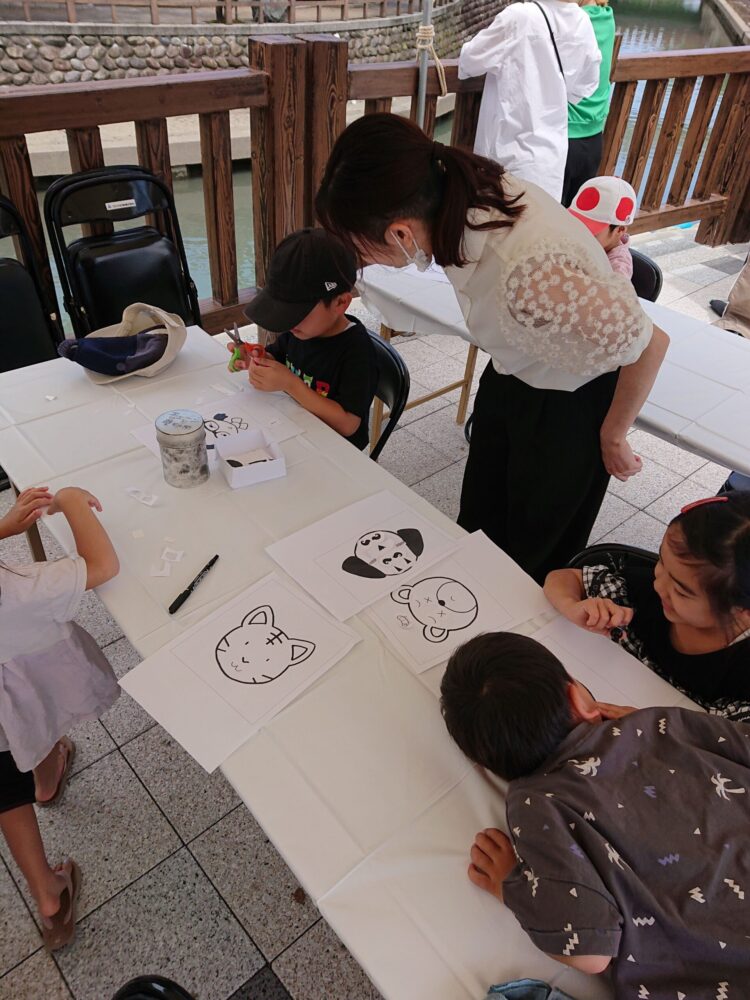 当日は、デザイン美術学科の学生が「マンガでヘン顔づくり」と題し、動物や子供の顔型に様々な形の眉、目、口を選んで貼り、色々な表情を作るワークショップを行い、たくさんの子どもたちが参加してくれました。
