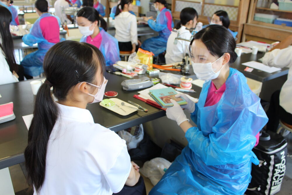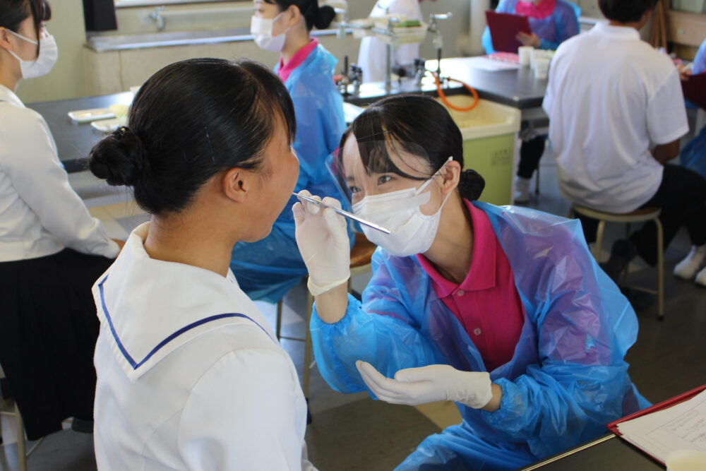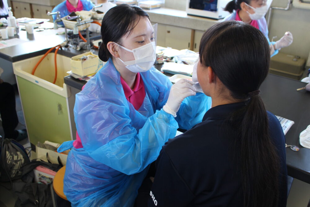 高等学校で「歯科保健指導」を行いました 令和5年7月4日(火)歯科衛生学科3年生が、岐阜県立大垣商業高等学校と岐阜県立大垣工業高等学校の高校生を対象に、歯科保健指導を行いました。 一人ひとりに歯磨き指導をしながら、食生活に関するアドバイスもさせていただきました。 高校生の皆さんは、真剣に指導やアドバイスを聞いてくれて、学生にとっても大変貴重な実習となりました。 2023/07/5ニュース