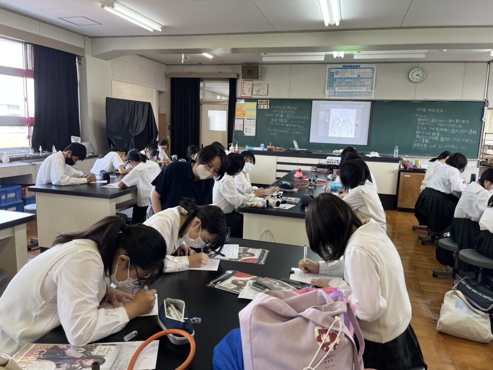 【デザイン美術学科】出前講座を行いました 令和5年7月21日(金)にデザイン美術学科の伊豫准教授と卒業生の松久助手が、岐阜県立大垣桜高等学校まんが研究部の生徒を対象に出前講座を行いました。 高校からのご依頼で「イラスト講座」を行い、高校生一人一人にあった指導をしました。また、日頃から描いている作品を講評したり、本学にとっても貴重な時間となりました。 2023/07/29出前講座・公開講座