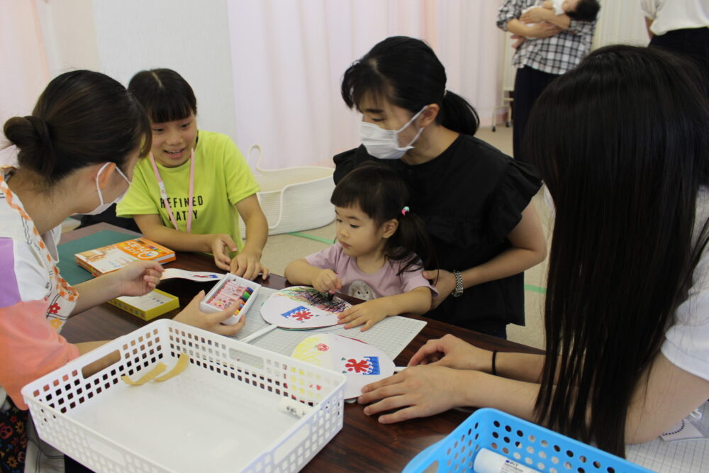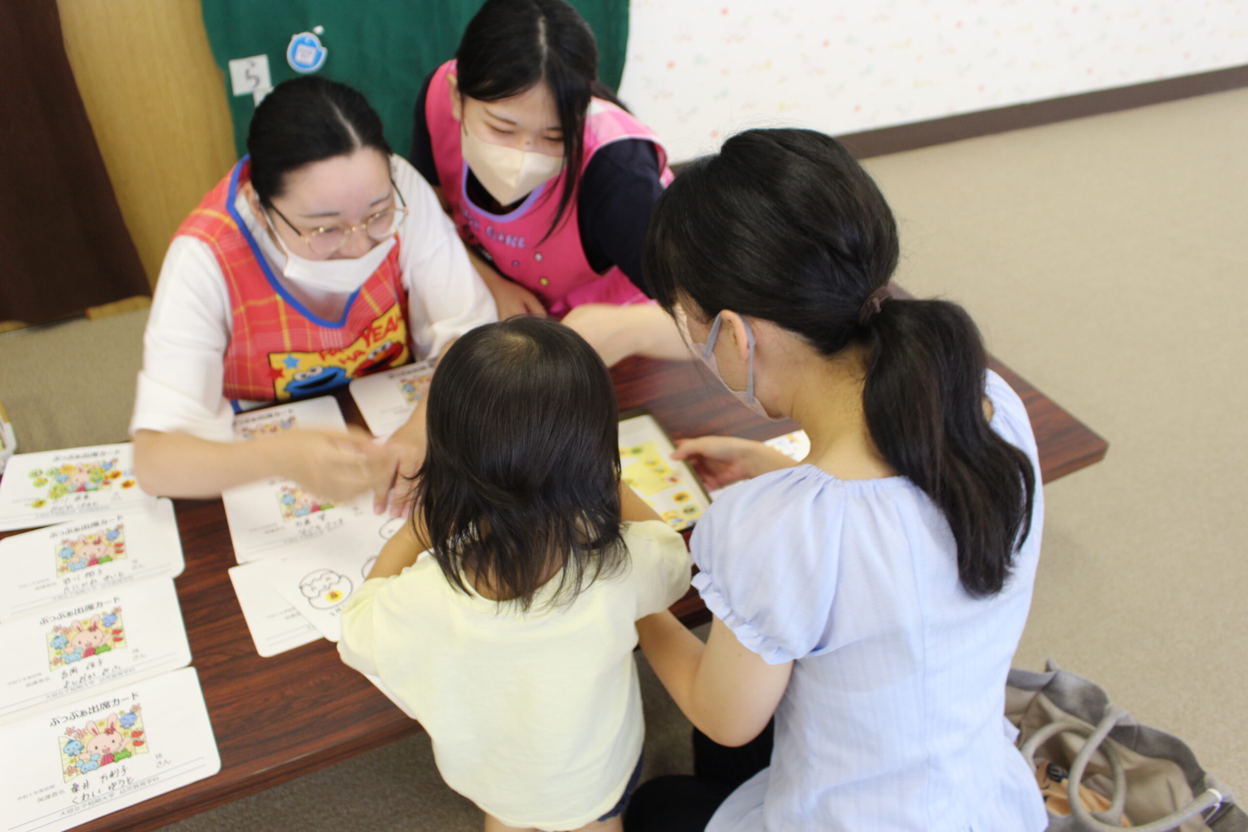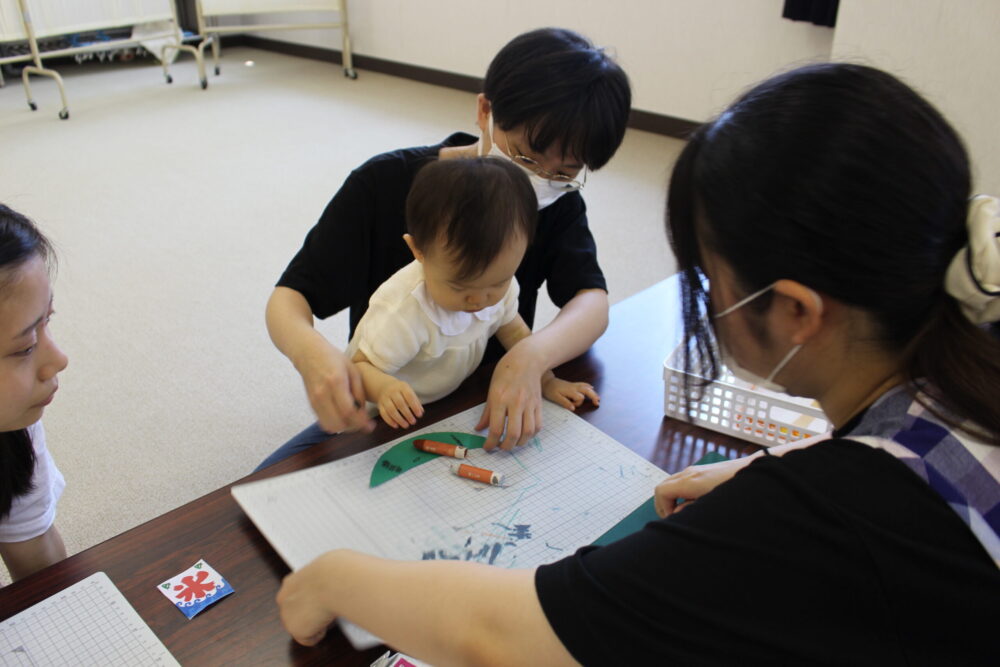 見学会では、キャンパスサポーターの学生と一緒に、手遊びや絵本の読み聞かせ、制作などをしながら、「ぷっぷぁ」を一緒に楽しみました。