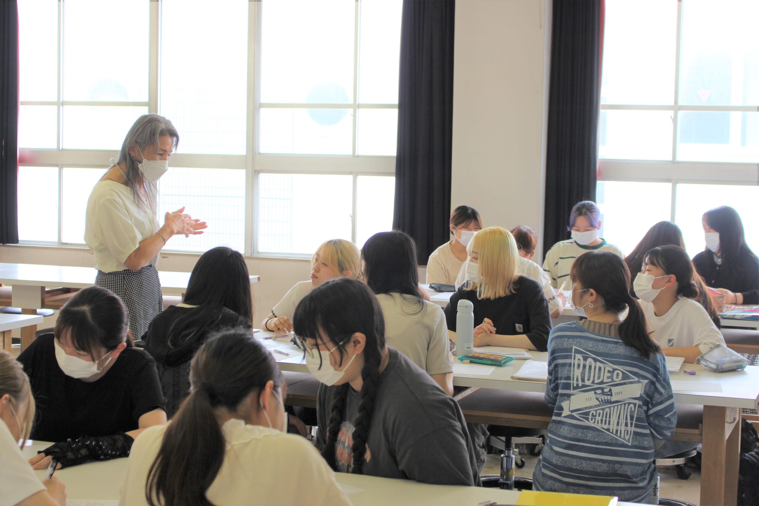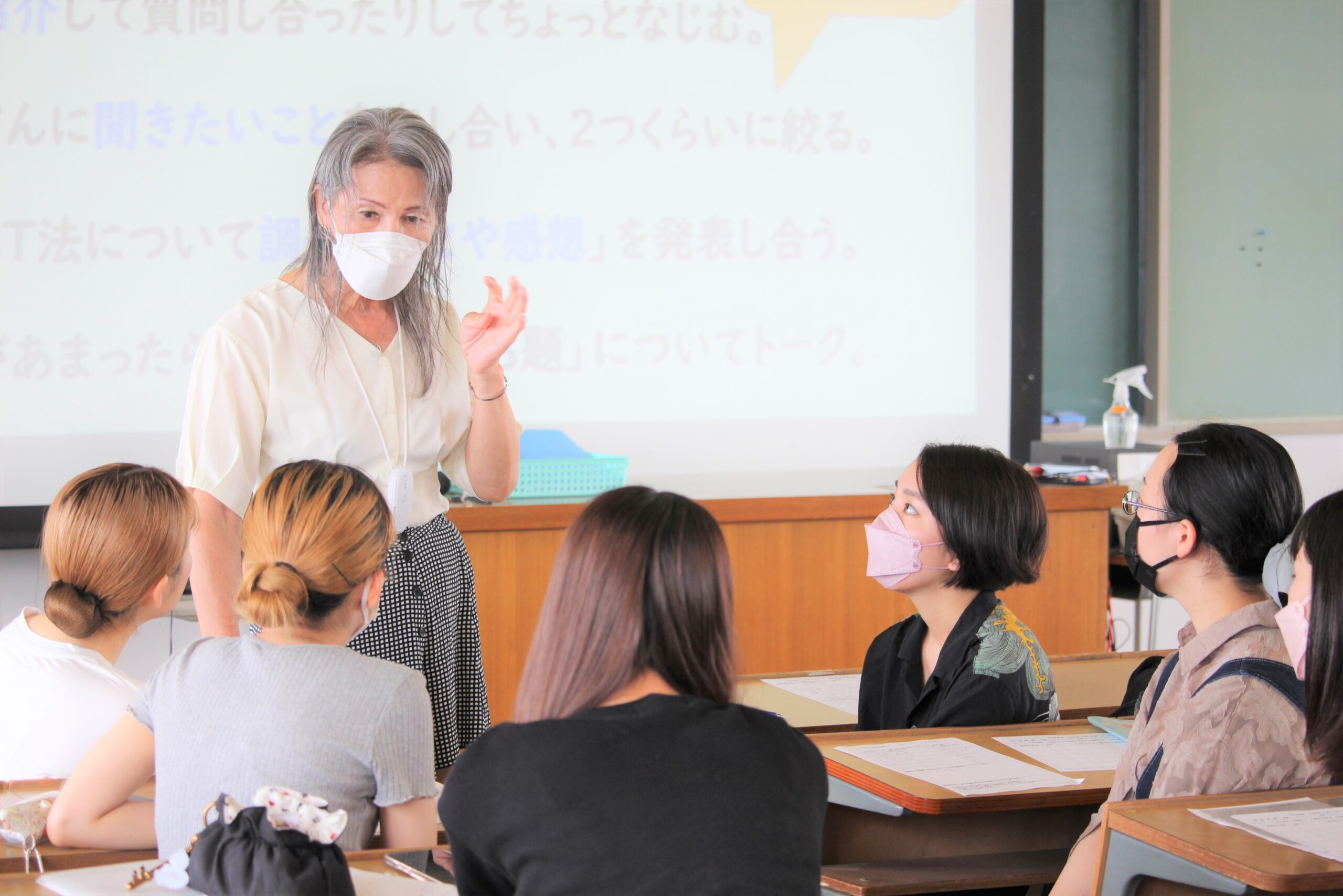 授業では、トランスジェンダー女性としてのこれまでの経験や、LGBTQ理解のための自治体等への働きかけ、当事者が直面する困難さなどについて話されました。また、学生たちがLGBT理解増進法について調べてきたことや自分の考えを発表するグループワークも行い、雪齋さんも各グループを回って学生たちと直接話したり質問に答えたりしてくださいました。LGBTQ関連の法律や判例に対する考えを問うグループもあれば、日ごろのおしゃれやメイクについて尋ねるグループもあり、当事者の視点や生の声から様々なことを感じ取ることのできる貴重な場となりました。