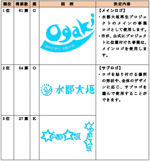 投票の結果、最も得票数が多かったG案が「メインロゴ」として決定しました。また、その他の案についても一定数の得票があり、それぞれに異なる魅力を持ち、甲乙つけがたいとの意見もあることから「サブロゴ」とし、使用の形状や全体のデザインに応じてロゴを選んで使用されることになりました。