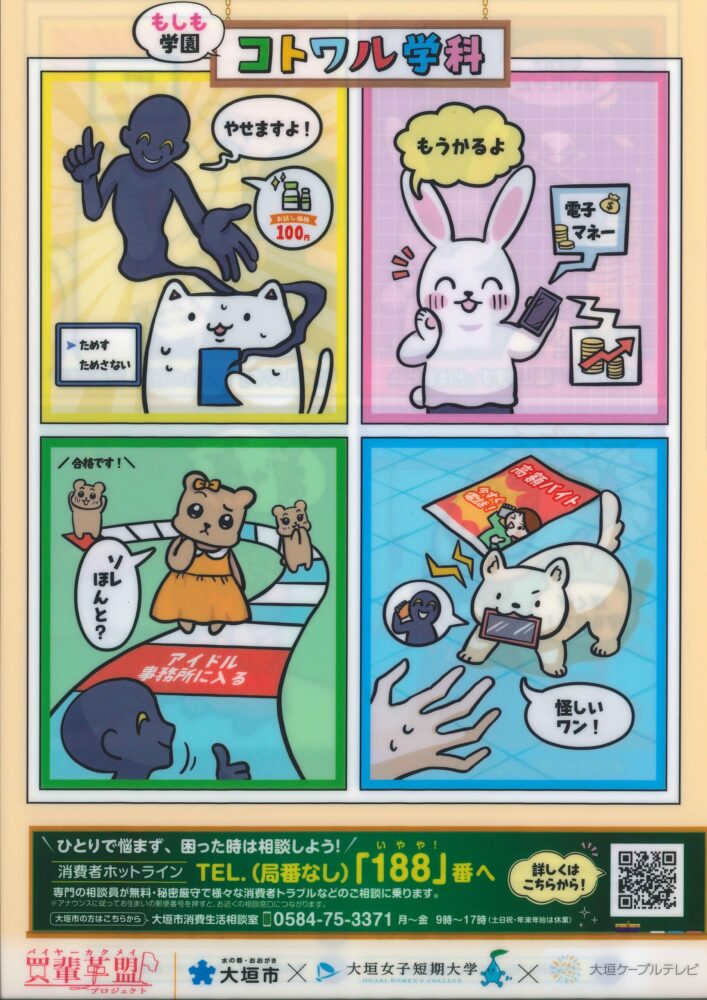 このイベントは、大垣女子短期大学と大垣市、大垣ケーブルテレビの協働プロジェクト『買輩革盟(バイヤーカクメイ)』が行うもので、本学からも学生と教員が参加します。当日はオリジナル缶バッジ作りの他に消費者詐欺防止グッズの配付もありますので、みなさんもぜひ来てください。