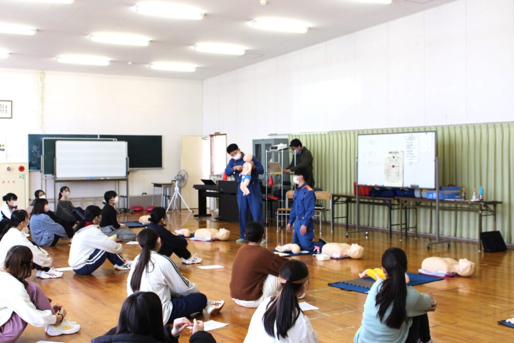 【幼児教育学科】1年次生が一次救命処置を学びました 令和5年12月21(木)に幼児教育学科1年次生が「幼児と健康」の授業で、大垣北消防署の方から一次救命処置(実技救命講習)を学びました。 AEDの使用方法や人工呼吸の手順を学び、成人だけではなく乳幼児を対象とした胸骨圧迫や背部叩打法などの実践も行いました。 改めて、一次救命処置の重要性を感じ、子どもの命を預かる保育現場での事故予防について考える機会となりました。 2023/12/24ニュース