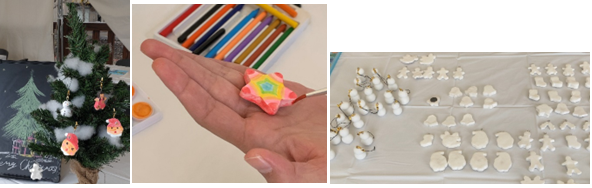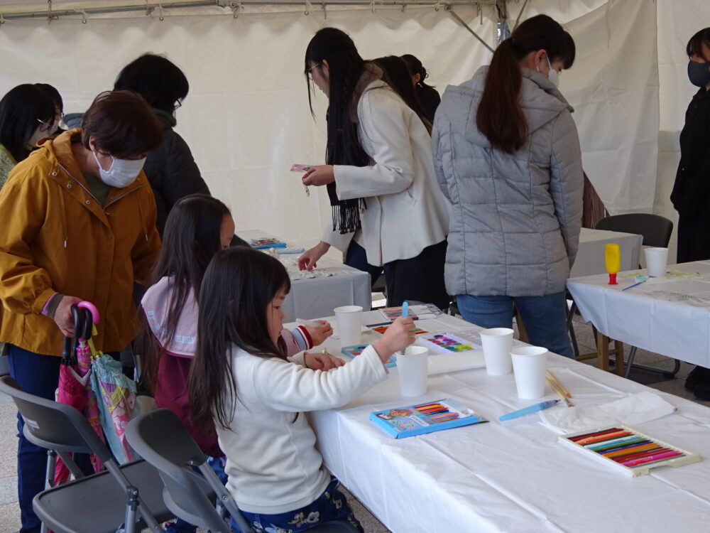 デザイン美術学科の学生と一緒に、オーナメントを作って、一足早いクリスマス気分を楽しんでいただく企画でした。学生が作ったオーナメント(装飾品)から、お好みのデザインを選んで色塗りを楽しんでいただきました。フォトスポットもご用意しました。完成後は、お持ち帰りいただきました。