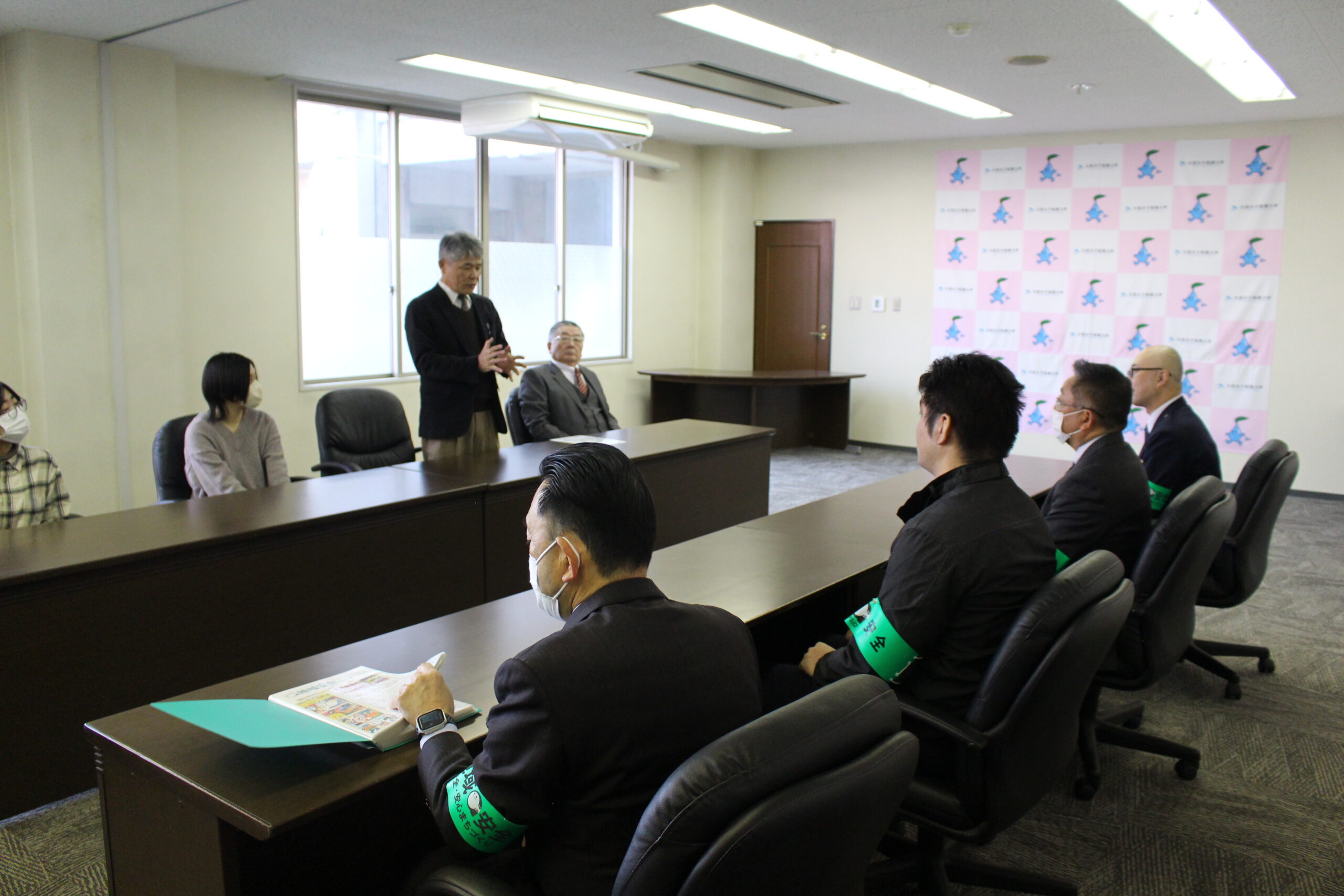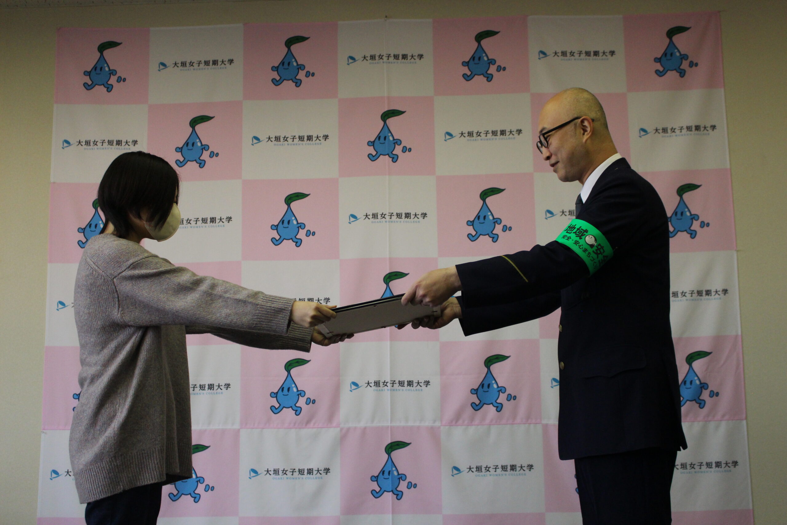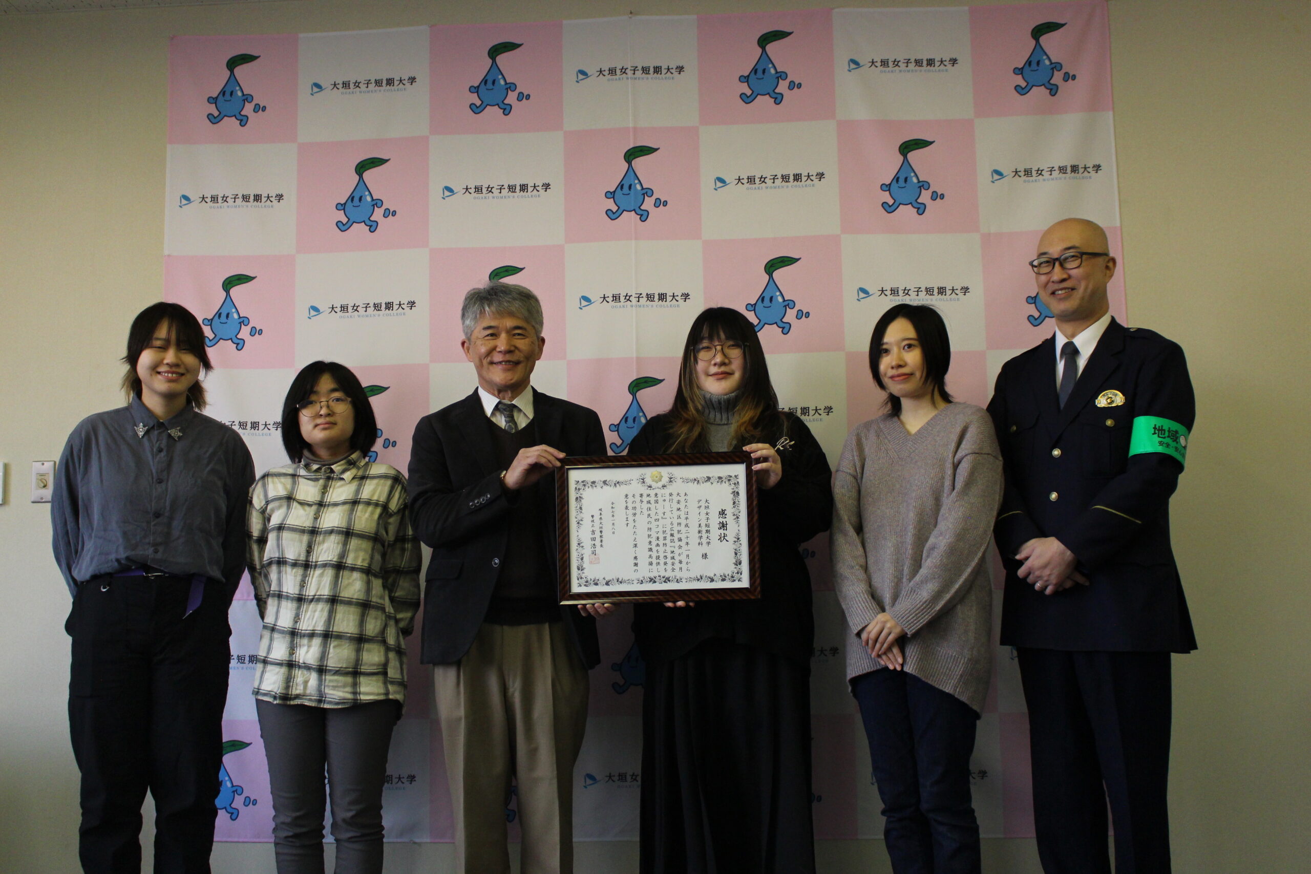 令和7年1月8日(水)、大安地区防犯協会の広報資料「地域安全にゅーす」内の「防犯漫画」に関わったデザイン美術学科の学生(卒業生を含む)とその監修にあたった田中久志教授に対して、大安地区防犯協会より「感謝状」が贈呈されました。