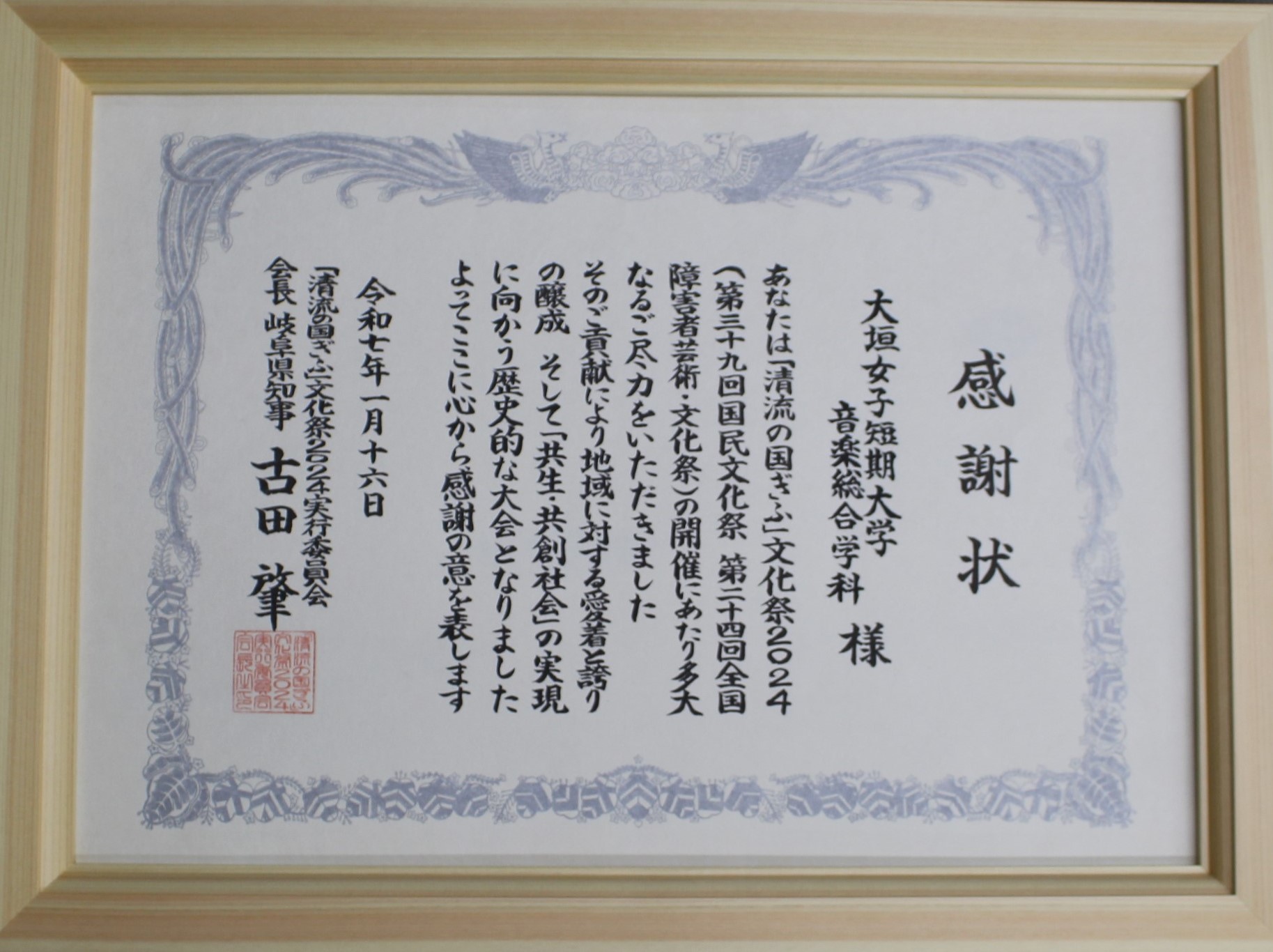 令和7年1月16日(木)、岐阜県庁にて「清流の国ぎふ」文化祭2024の感謝状贈呈式があり、古田肇実行委員会会長・岐阜県知事より本学音楽総合学科に感謝状が贈呈されました。音楽総合学科は、「清流の国ぎふ」文化祭の開会式・閉会式に出演し、演奏しました。
