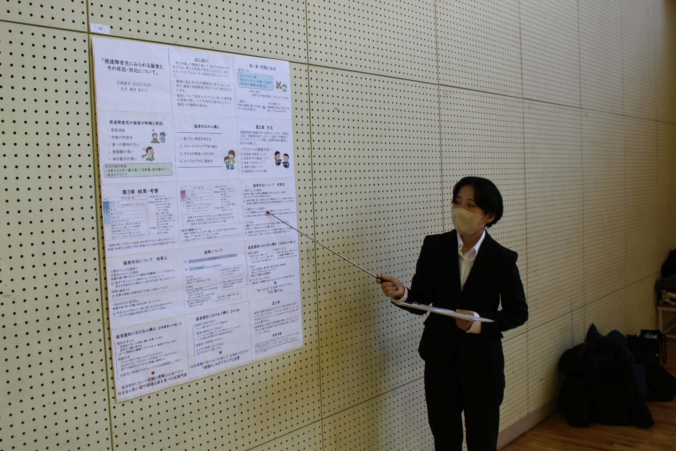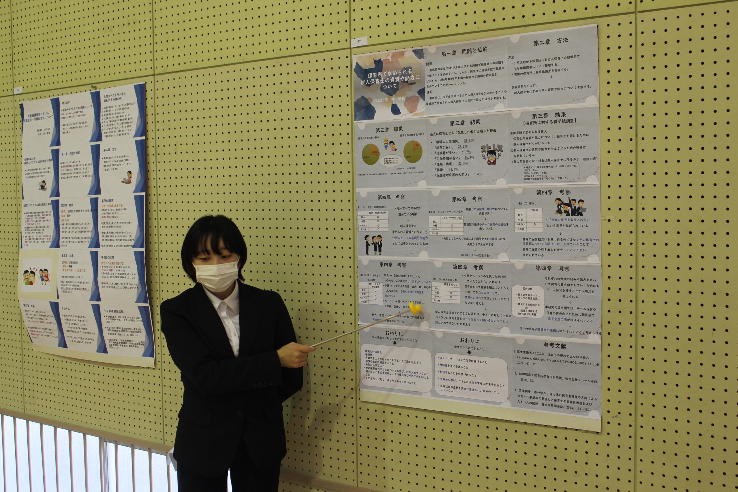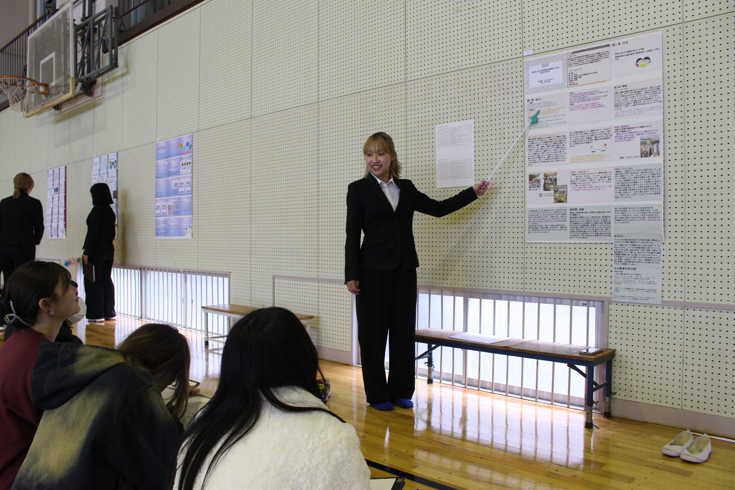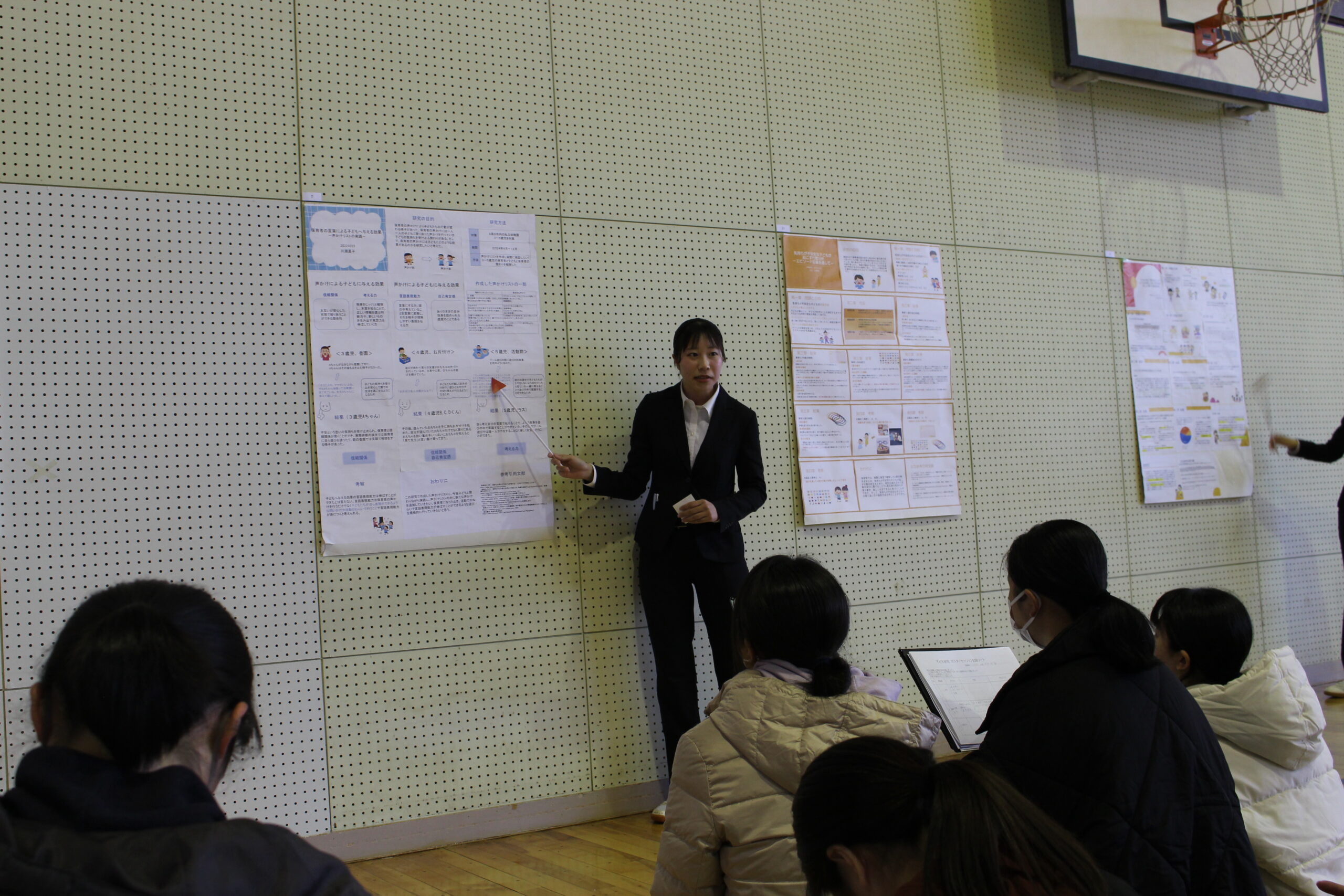 令和7年1月22日(水)、幼児教育学科による卒業研究報告会が体育会1階で行われました。本学では、幼児教育(福祉)に関わる分野を2年生では「子どもの基礎研究Ⅰ・Ⅱ」、3年生では「子ども研究Ⅰ・Ⅱ」を経て研究を深めています。3年生の4月に研究テーマを決め、9月の幼教合宿で中間発表を行い、12月には研究の成果を論文にまとめます。