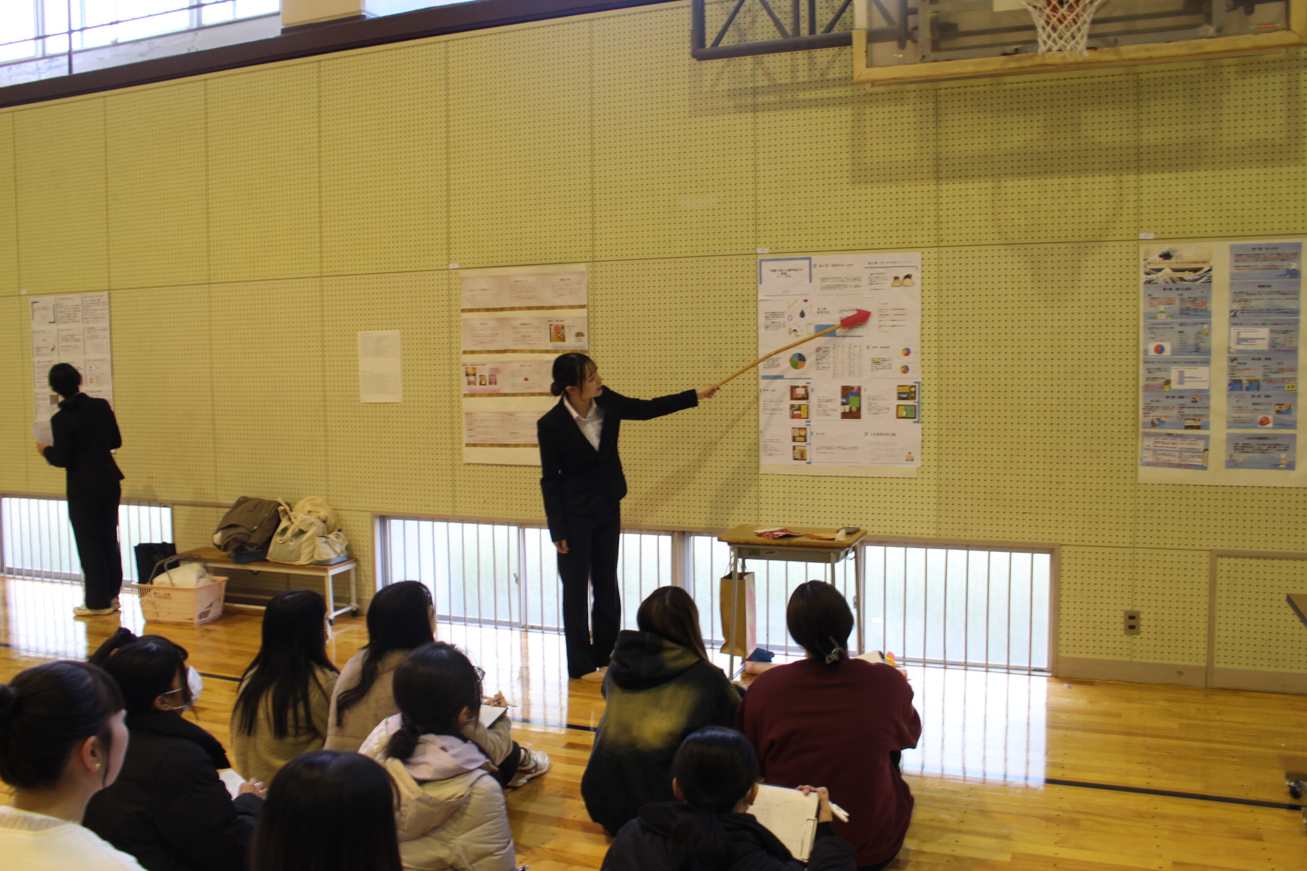 卒業研究報告会では、ポスターセッションの形式で行われ、学生は1年間の研究成果を1枚の模造紙にまとめたポスターの前で、テーマ、調査・検証結果、考察に至るまでを1、2年生や教職員前で説明しました。スーツ姿で、3年間で積み上げてきた研究成果を論理的に展開していく主体的な姿、1、2年生や教職員の質問に答える姿は、3年間で大きく成長したことを物語っていました。
