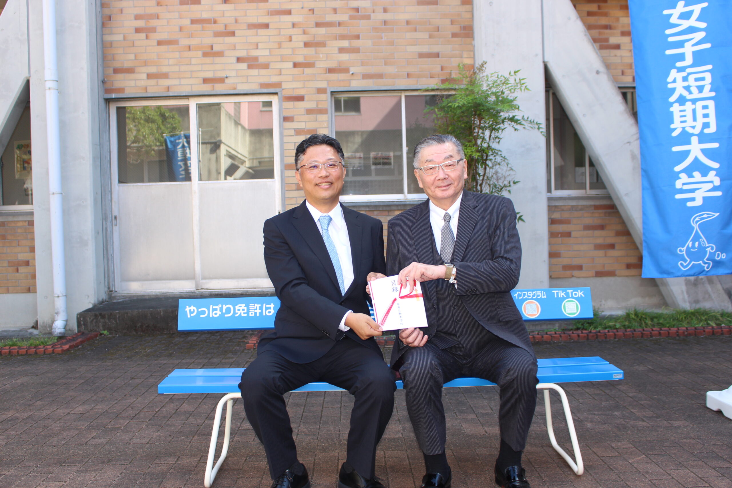 このたび、大垣市内の東海自動車学校様より大垣女子短期大学に長椅子ベンチ8台をご寄贈していただけることになり、本学で贈呈式を執り行いました。