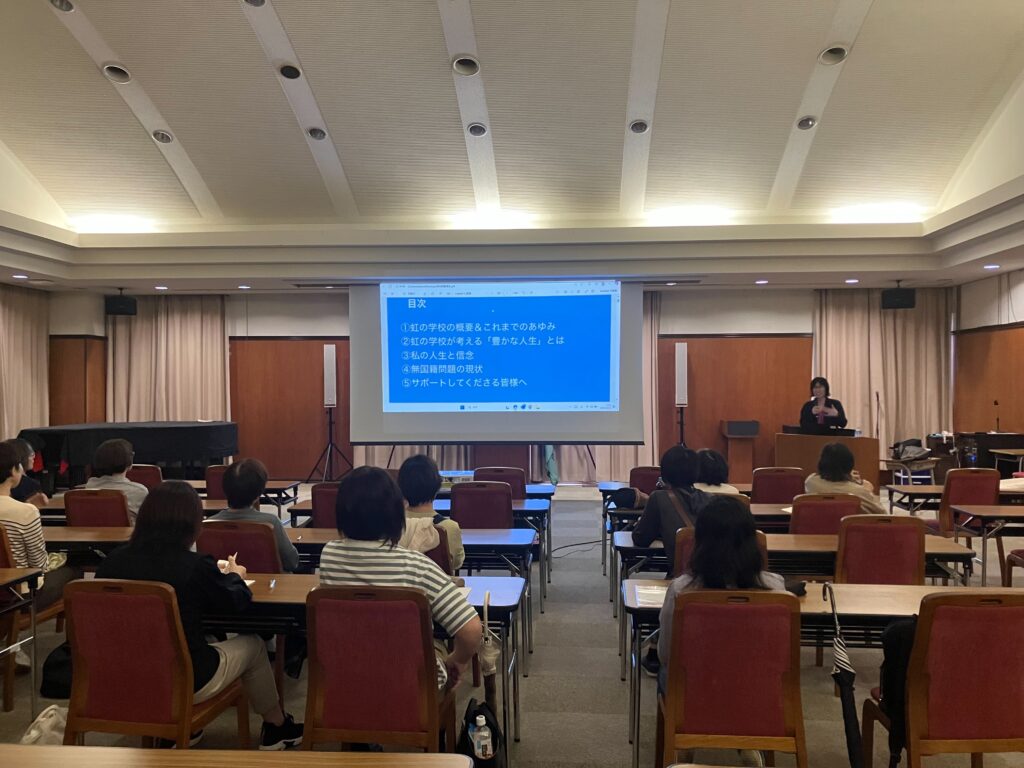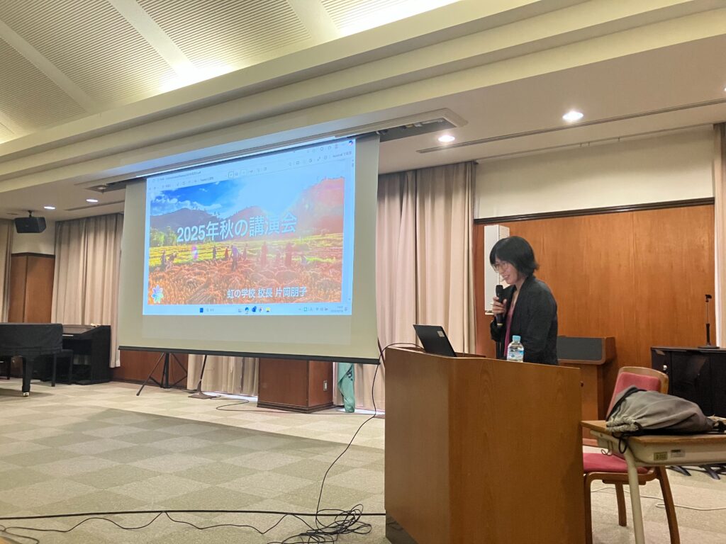 公開授業を行いました 10月16日(木)に「虹の学校が考える本当の豊かさ」と題して公開授業を行いました。 講師は、タイで無国籍児童に教育活動を実践されている片岡朋子先生に、音楽や美術も含む教育の大切さや、自然の中で暮らす子どもたちや周囲の村人達の豊かさと現在の私たちの価値観の違いなど、多角的な視点からのお話をいただき、一般の方と学生たちが一緒に受講し貴重な学びの機会となりました。 2025/10/20ニュース