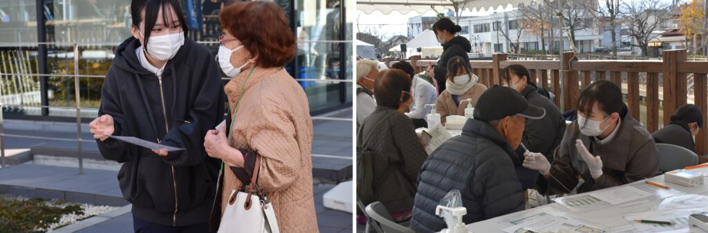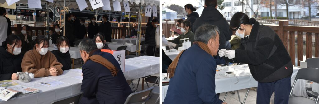 今年最後の「まちなかスクエアガーデン※1」が12月7日(日)に快晴のもとで開催され、大垣女子短期大学歯科衛生学科の2年次生が、多くの方に「お口の健康啓発活動」を行いました。本学ブースにお越しになられた方の数は、昨年度の2倍強であり、学生とって大変忙しい時間ではありましたが、高齢者、中高生、幼児など多世代の方に、授業で学んだ歯科衛生士としての専門知識を活かした活動を実施できたことは、学びを深めるきっかけになり、また、コミュニケーション力を高める機会となりました。