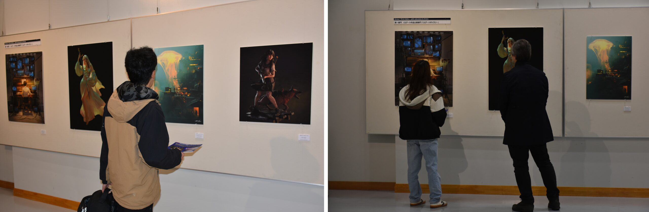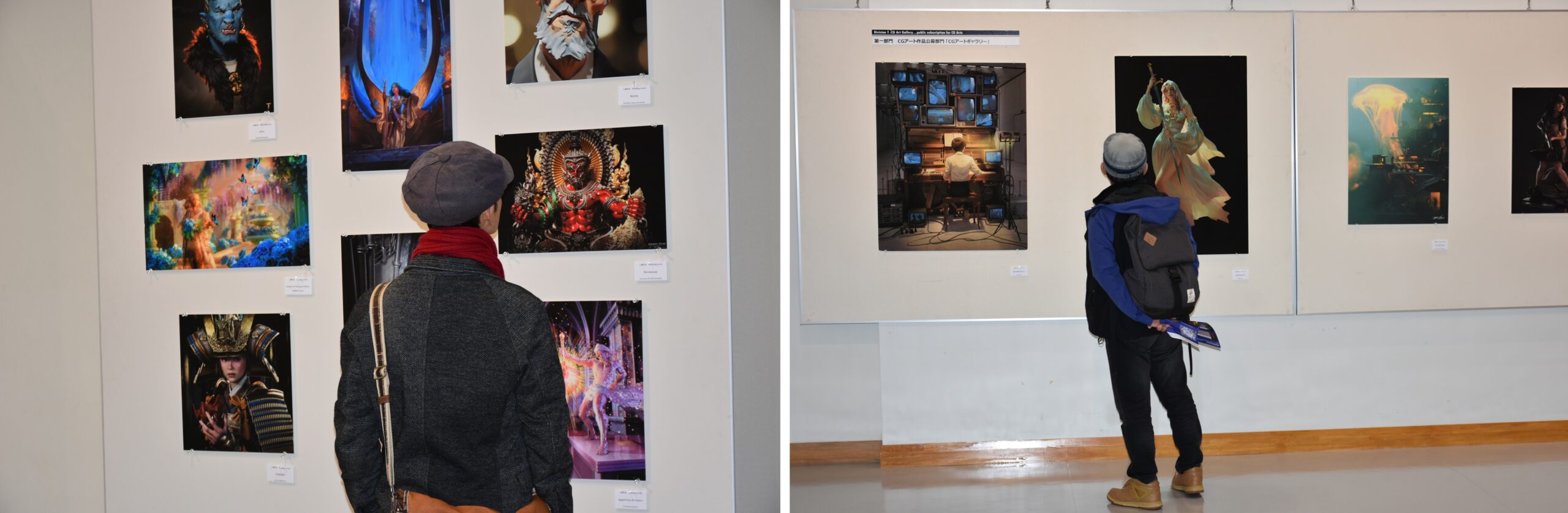 開催期間中は、中学生から高齢者まで非常に幅広い世代の方、また、外国人の方もご来場され、色彩豊かで、独創的なCGアートの世界を堪能されました。来場者数は、昨年を上回る結果となり、多くの方に、CGアートの世界を身近に感じてもらえたと思います。会場には、本学学生スタッフ以外に、本学専任教員も常駐し、来場者からアジアの国・地域とアジア以外でのCG作品の違い、CGに関する専門的な事柄についての質問に答えるシーンもありました。また、CGについて多くの知識が無い方からは、手書きとCGの違い、CGを用いた作品の作り方などの質問も受けました。