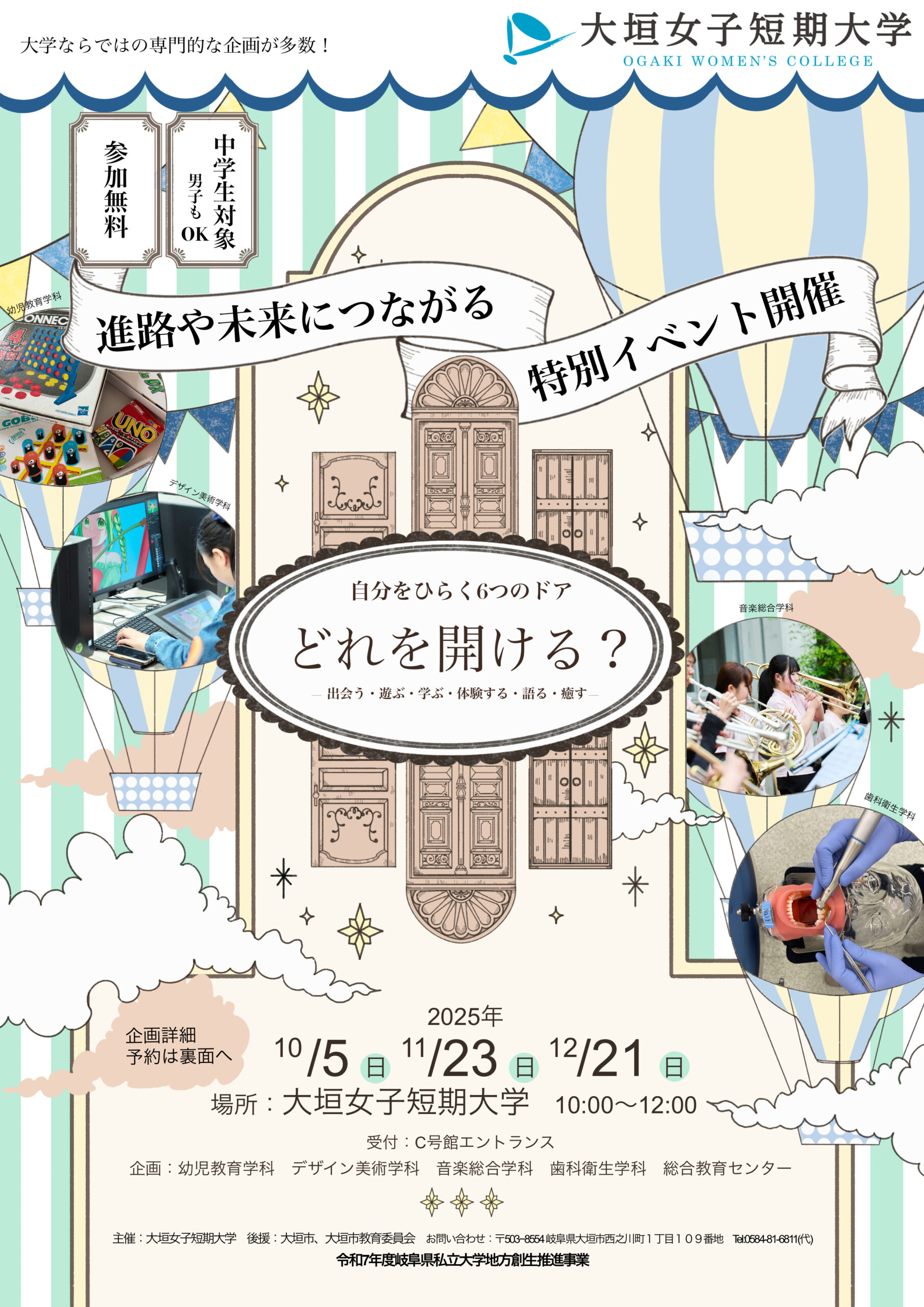 令和7年度岐阜県私立大学地方創生推進事業の一環として、本学が提案するこどもの居場所を開設します。ここでは、「出会う」「遊ぶ」「学ぶ」「体験する」「語る」「癒す」の6つのテーマにそった多彩な企画を通して、自分らしさを発見したり、新しい世界と出会ったりできる特別な時間をご用意しています。みなさんとステキな空間と時間を共有できる居場所づくりを目指します。ここでの時間が、みなさんの未来や進路につながると嬉しいです。