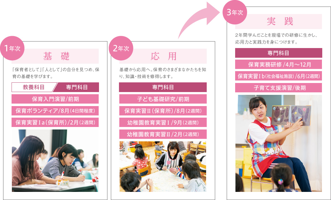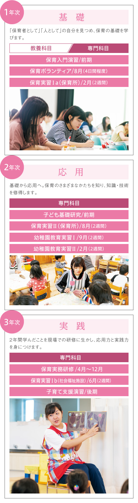 「先生大好き!」と子どもたちから信頼され、笑顔があふれる保育者になるために、1、2年次は保育に関する知識や技術、保育観を養い、3年次では実践力を身につけます。