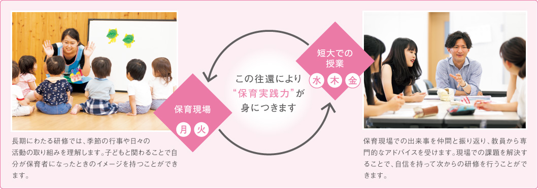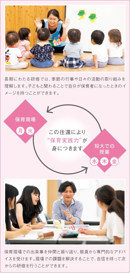1・2年次に保育に関する知識と技術、保育観を養い、3年次に、4月~12月の長期にわたって、⽉‧⽕が保育現場、⽔‧⽊‧⾦が⼤学というサイクルを繰り返す『保育実務研修』があります。実務に近い内容で現場経験を積むだけでなく、大学でしっかり振り返ることで、“できる”と言える自分になるための自信と実践力が身につきます。さらに、季節ごとの⾏事など1年の流れを体験することができるため、保育者1年目の不安を解消することもできます。