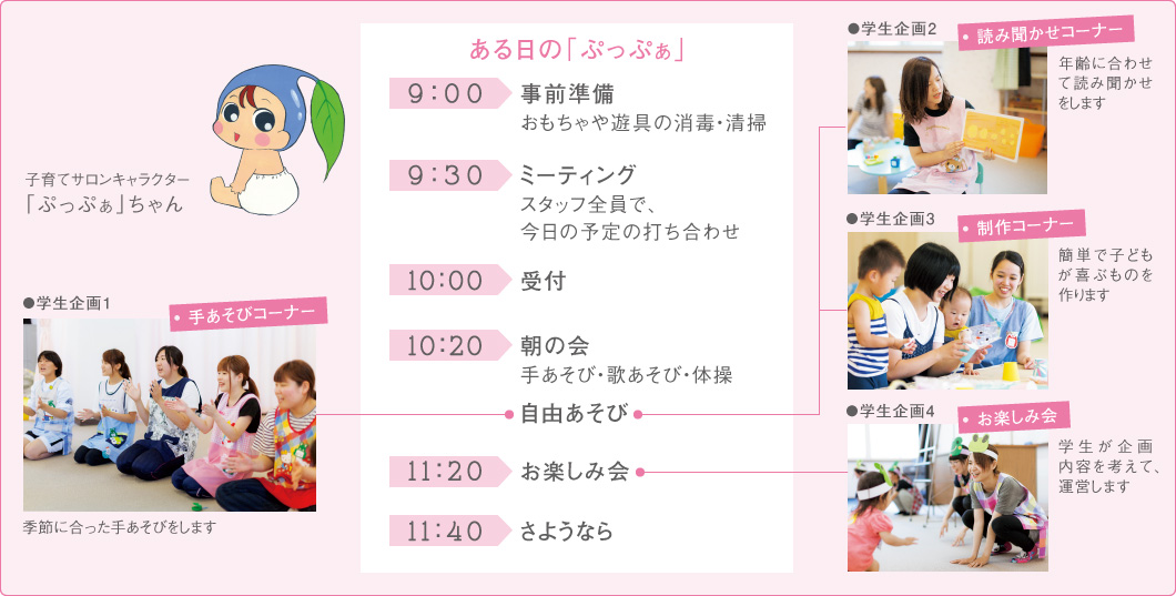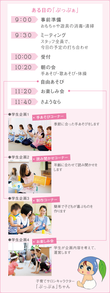 2年次前期の「子ども基礎研究」と3年次後期の「子育て支援演習」では、学生が主体となって子育てサロン『ぷっぷぁ』を企画・運営し、子どもに対する理解だけでなく保護者への理解も深めることで、より高い実践力を身につけます。