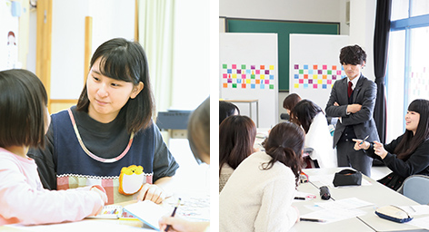 実習・研修の現場での体験から得た保育に関する事例を大学の授業で振り返ります。保育現場の学びの中から実践的研究・社会人基礎力・保育構想力を備えた保育実践力を育成し、保育者としての成長に繋げていきます。