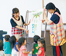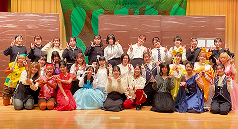 幼児の想像力や情操を高めるための題材を決め、さまざまな表現方法、音楽、舞台演出などを試みながらひとつの劇をつくりあげ、「こども祭」で上演します。保育現場における即戦力となるために必要な技術と指導力を養います。