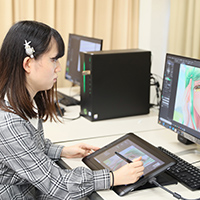 1年次前期で、ゲーム・CG、コミックイラストレーション、マンガ、メディアデザイン 3つのコースの基礎を横断的に学び、1年次後期にコースを選択。コースに捉われず興味のある授業を履修して、自らの表現方法をみつけることができます。